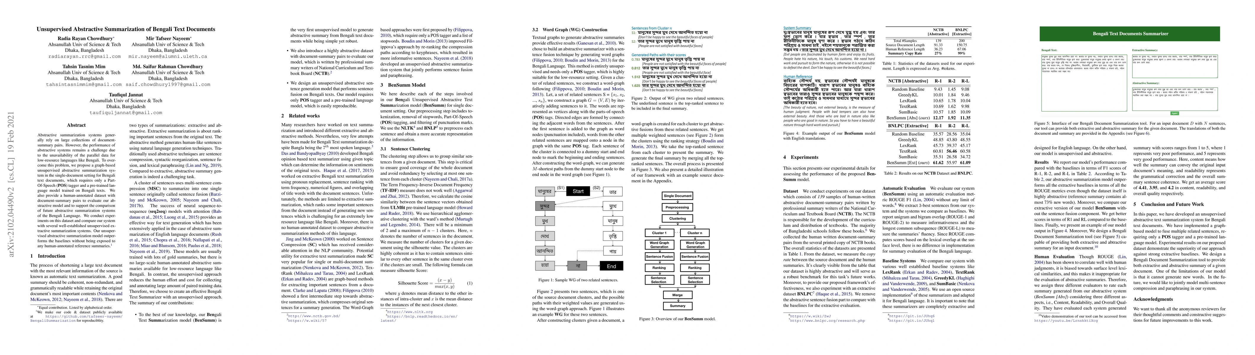 This paper proposes an unsupervised abstractive summarization system for Bengali text, requiring only a POS tagger and a pre-trained Bengali language model, and introduces a new dataset for evaluation. The model outperforms existing unsupervised extractive summarization systems without using human-annotated summaries.