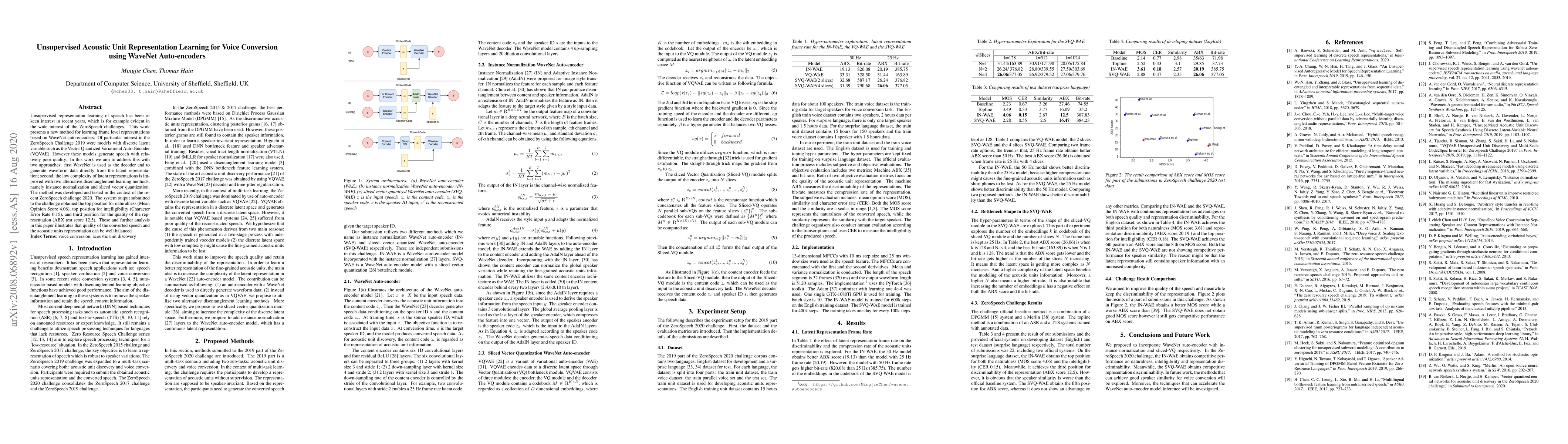 This paper proposes an unsupervised method for learning acoustic unit representations using WaveNet auto-encoders for voice conversion. It improves representation quality through WaveNet decoders and disentanglement techniques, achieving top scores in naturalness and intelligibility in the ZeroSpeech challenge 2020.