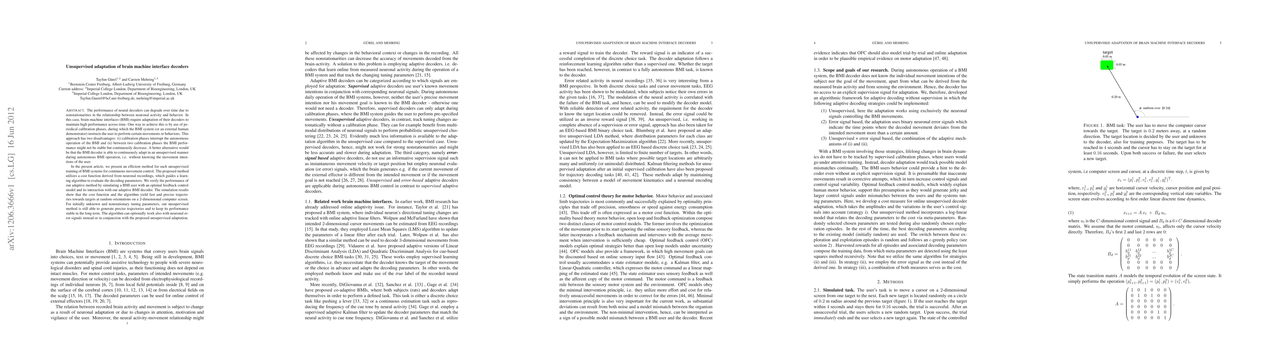 The performance of neural decoders can degrade over time due to nonstationarities in the relationship between neuronal activity and behavior. In this case, brain-machine interfaces (BMI) require adaptation of their decoders to maintain high performance across time. One way to achieve this is by use of periodical calibration phases, during which the BMI system (or an external human demonstrator) instructs the user to perform certain movements or behaviors. This approach has two disadvantages: (i) calibration phases interrupt the autonomous operation of the BMI and (ii) between two calibration phases the BMI performance might not be stable but continuously decrease. A better alternative would be that the BMI decoder is able to continuously adapt in an unsupervised manner during autonomous BMI operation, i.e. without knowing the movement intentions of the user. In the present article, we present an efficient method for such unsupervised training of BMI systems for continuous movement control. The proposed method utilizes a cost function derived from neuronal recordings, which guides a learning algorithm to evaluate the decoding parameters. We verify the performance of our adaptive method by simulating a BMI user with an optimal feedback control model and its interaction with our adaptive BMI decoder. The simulation results show that the cost function and the algorithm yield fast and precise trajectories towards targets at random orientations on a 2-dimensional computer screen. For initially unknown and non-stationary tuning parameters, our unsupervised method is still able to generate precise trajectories and to keep its performance stable in the long term. The algorithm can optionally work also with neuronal error signals instead or in conjunction with the proposed unsupervised adaptation.