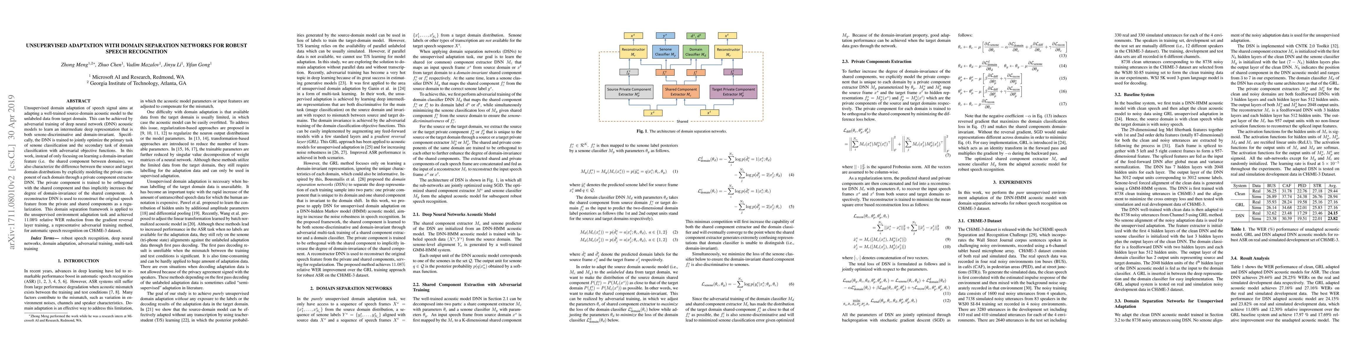 This paper proposes an unsupervised domain adaptation method for robust speech recognition using domain separation networks. The approach combines adversarial training with a private component extractor to model domain differences, achieving an 11.08% relative reduction in word error rate compared to gradient reversal layer training on the CHiME-3 dataset.
