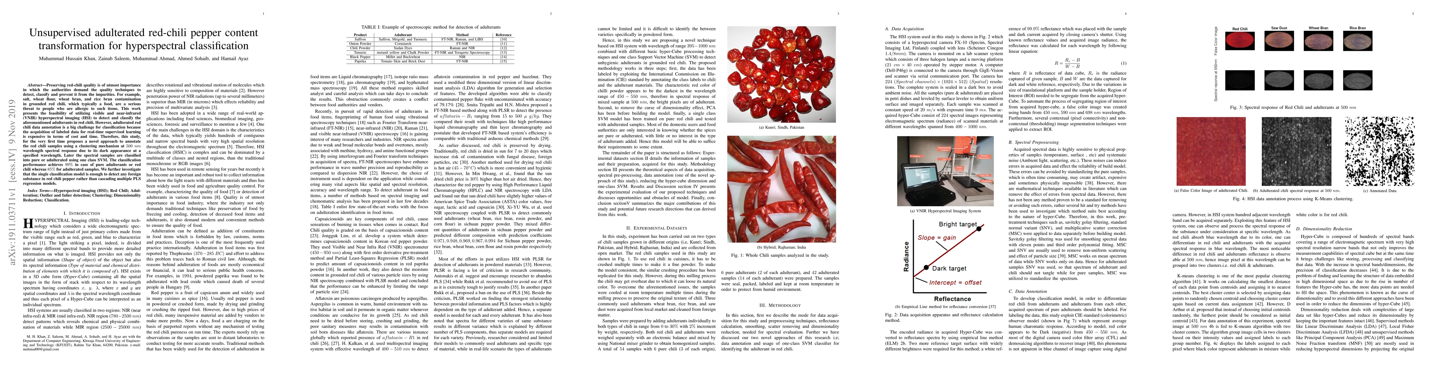 Preserving red-chili quality is of utmost importance in which the authorities demand the quality techniques to detect, classify and prevent it from the impurities. For example, salt, wheat flour, wheat bran, and rice bran contamination in grounded red chili, which typically a food, are a serious threat to people who are allergic to such items. This work presents the feasibility of utilizing visible and near-infrared (VNIR) hyperspectral imaging (HSI) to detect and classify the aforementioned adulterants in red chili. However, adulterated red chili data annotation is a big challenge for classification because the acquisition of labeled data for real-time supervised learning is expensive in terms of cost and time. Therefore, this study, for the very first time proposes a novel approach to annotate the red chili samples using a clustering mechanism at 500~nm wavelength spectral response due to its dark appearance at a specified wavelength. Later the spectral samples are classified into pure or adulterated using one-class SVM. The classification performance achieves 99% in case of pure adulterants or red chili whereas 85% for adulterated samples. We further investigate that the single classification model is enough to detect any foreign substance in red chili pepper rather than cascading multiple PLS regression models.