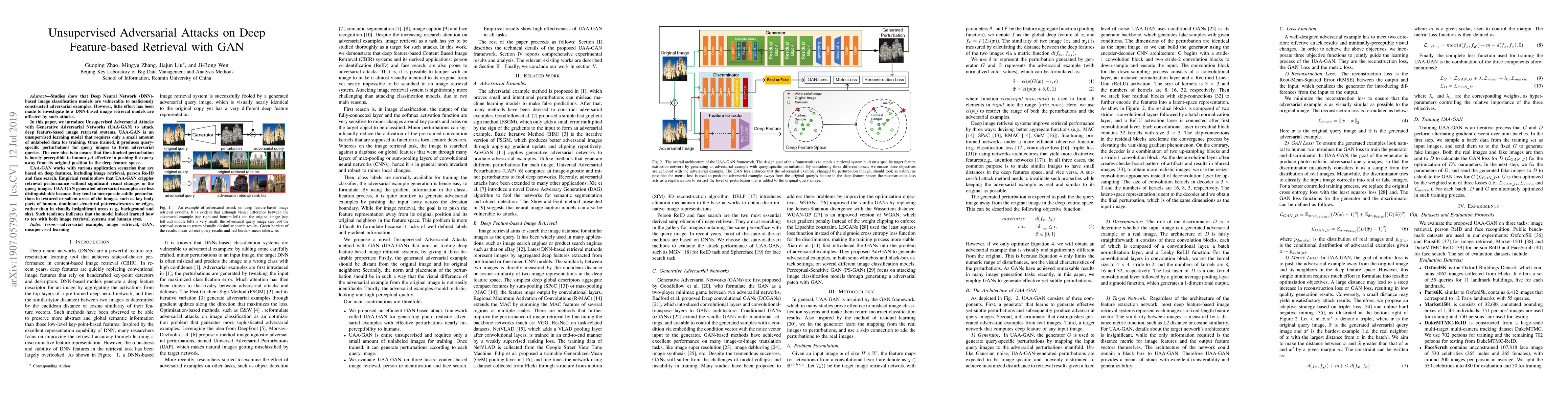 This paper introduces Unsupervised Adversarial Attacks with Generative Adversarial Networks (UAA-GAN) to disrupt deep feature-based image retrieval systems, requiring minimal unlabeled data for training. UAA-GAN generates subtle, imperceptible perturbations to query images that significantly degrade retrieval performance without noticeable visual changes.