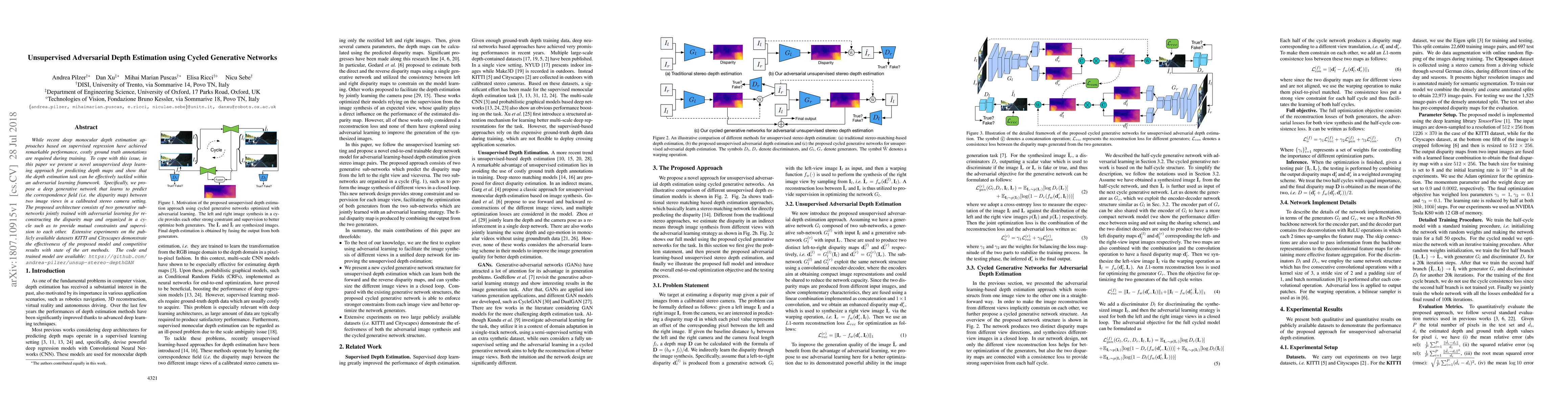 This paper introduces an unsupervised deep learning method for depth estimation using adversarial learning and cycled generative networks. The approach predicts depth maps without ground truth annotations, leveraging mutual constraints from two generative sub-networks to reconstruct disparity maps, achieving competitive results on KITTI and Cityscapes datasets.