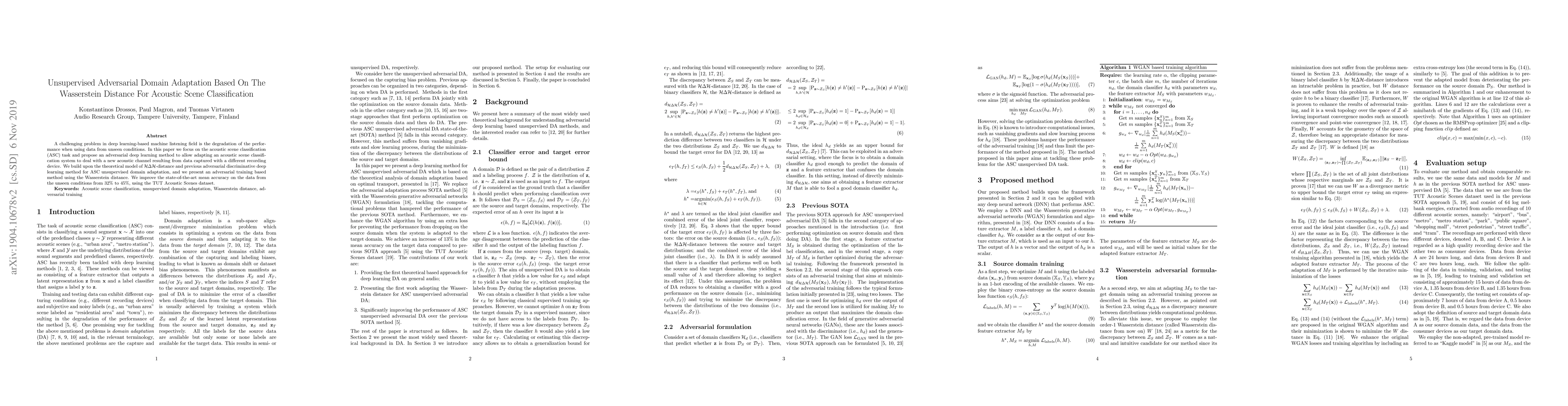 This paper proposes an unsupervised adversarial domain adaptation method using the Wasserstein distance to improve acoustic scene classification performance under unseen conditions. The method enhances mean accuracy from 32% to 45% on the TUT Acoustic Scenes dataset.