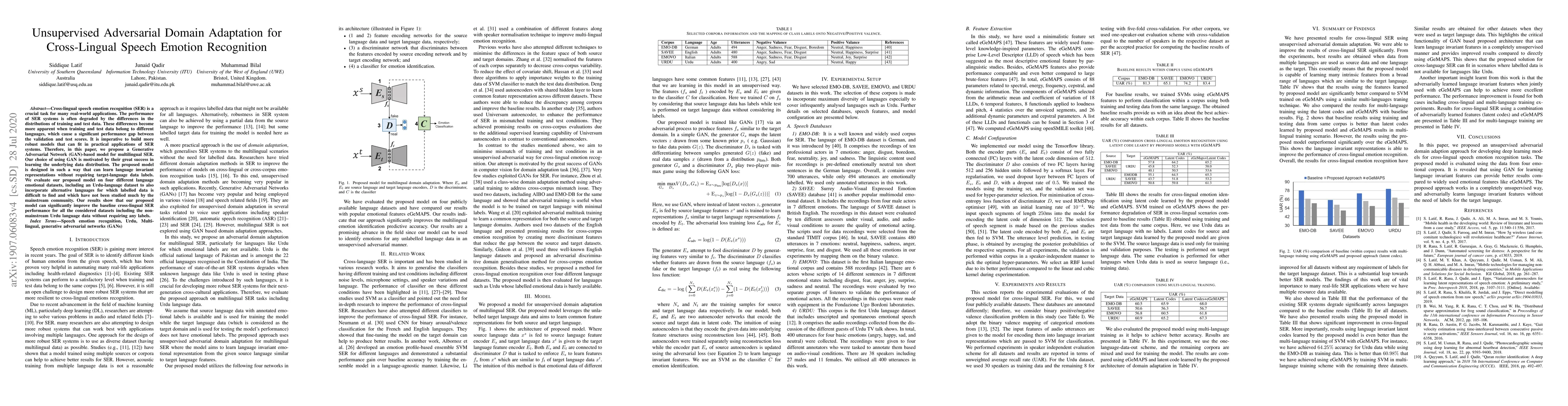 This paper proposes an unsupervised adversarial domain adaptation model using Generative Adversarial Networks (GAN) for improving cross-lingual speech emotion recognition, achieving significant performance gains without requiring target-language labels, evaluated across multiple languages including Urdu.