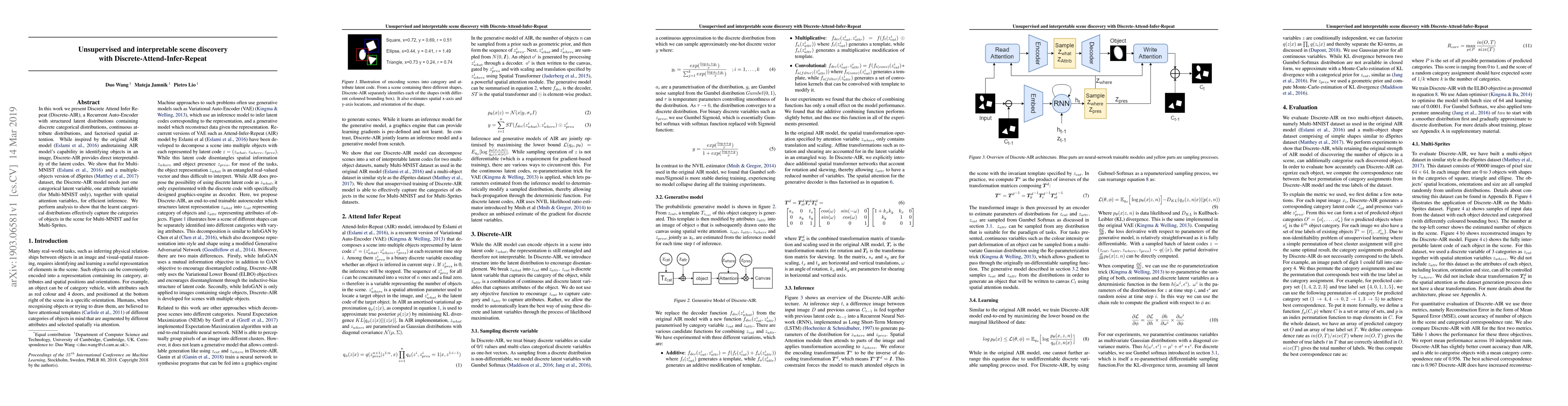 This paper introduces Discrete-AIR, a Recurrent Auto-Encoder that enhances interpretability through structured latent distributions. It effectively identifies objects in images and captures object categories using minimal latent variables, demonstrating success on Multi-MNIST and dSprites datasets.