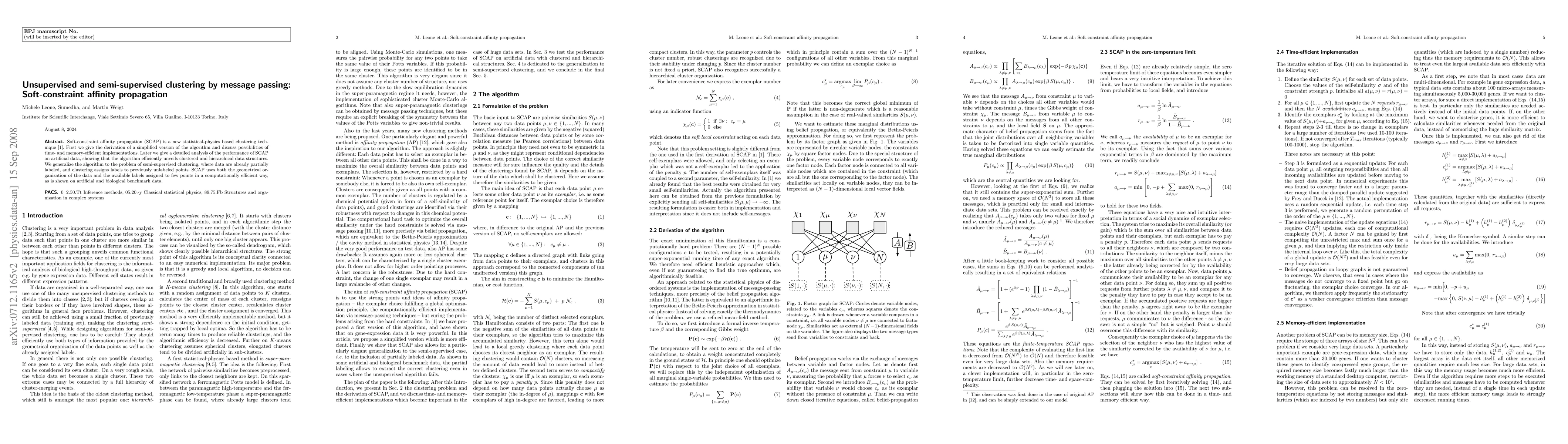 Soft-constraint affinity propagation (SCAP) is a new statistical-physics based clustering technique. First we give the derivation of a simplified version of the algorithm and discuss possibilities of time- and memory-efficient implementations. Later we give a detailed analysis of the performance of SCAP on artificial data, showing that the algorithm efficiently unveils clustered and hierarchical data structures. We generalize the algorithm to the problem of semi-supervised clustering, where data are already partially labeled, and clustering assigns labels to previously unlabeled points. SCAP uses both the geometrical organization of the data and the available labels assigned to few points in a computationally efficient way, as is shown on artificial and biological benchmark data.