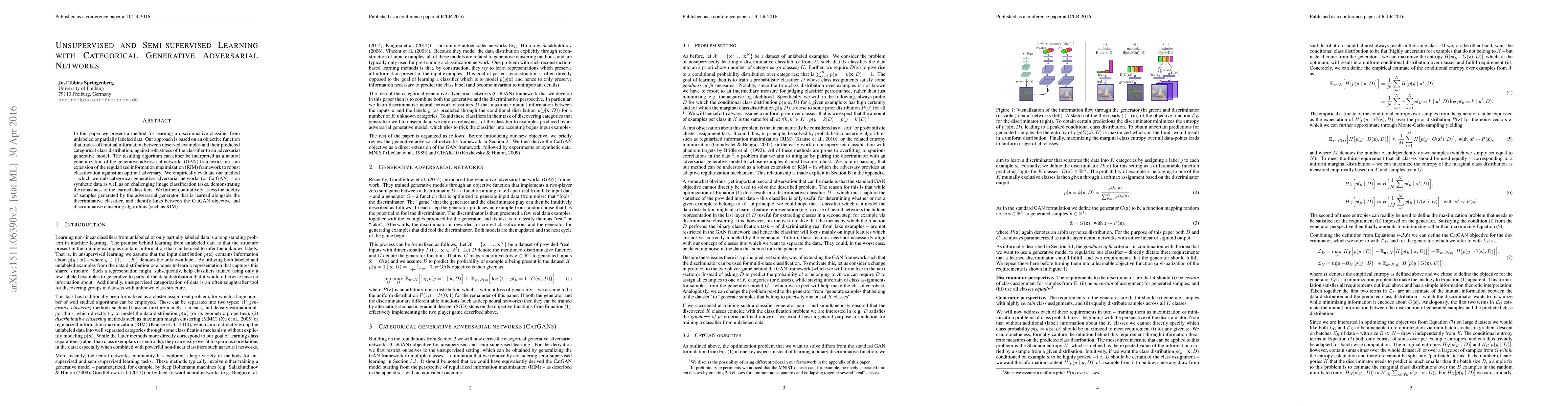 This paper introduces a novel method called categorical generative adversarial networks (CatGAN) for learning discriminative classifiers from unlabeled or partially labeled data. The method balances mutual information and classifier robustness against an adversarial generative model, demonstrating effectiveness on synthetic and image classification tasks.