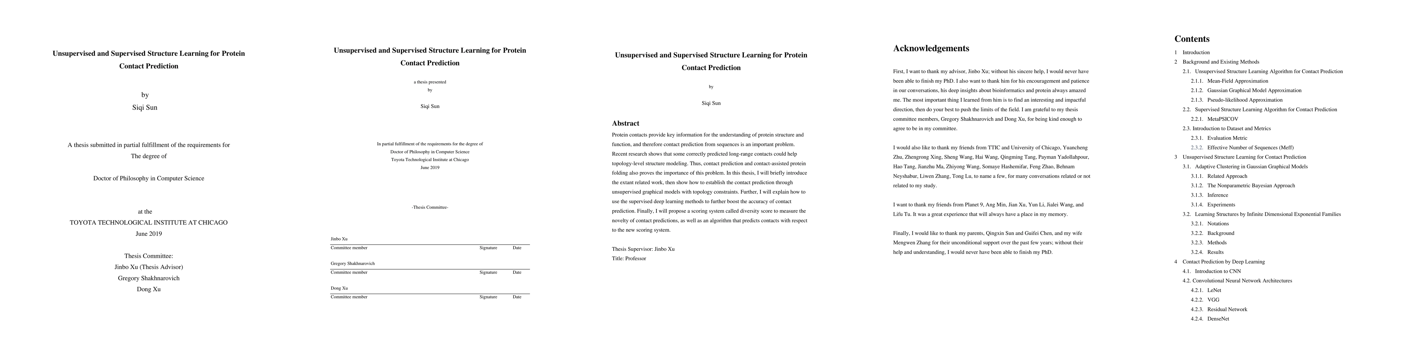 Protein contacts provide key information for the understanding of protein structure and function, and therefore contact prediction from sequences is an important problem. Recent research shows that some correctly predicted long-range contacts could help topology-level structure modeling. Thus, contact prediction and contact-assisted protein folding also proves the importance of this problem. In this thesis, I will briefly introduce the extant related work, then show how to establish the contact prediction through unsupervised graphical models with topology constraints. Further, I will explain how to use the supervised deep learning methods to further boost the accuracy of contact prediction. Finally, I will propose a scoring system called diversity score to measure the novelty of contact predictions, as well as an algorithm that predicts contacts with respect to the new scoring system.