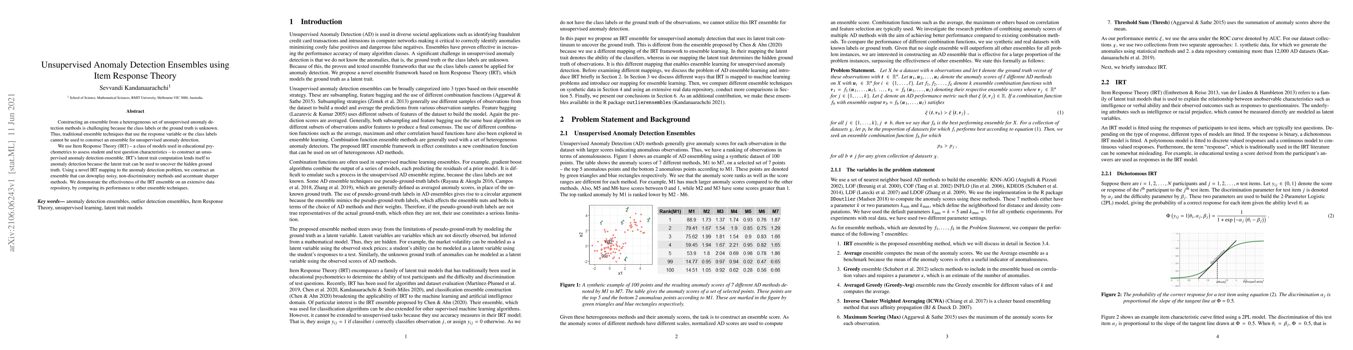 This paper proposes an unsupervised anomaly detection ensemble constructed using Item Response Theory (IRT), which leverages latent trait computation to identify hidden ground truth without labeled data. The IRT ensemble method effectively balances noisy and sharp detection methods, demonstrating superior performance compared to other ensemble techniques.