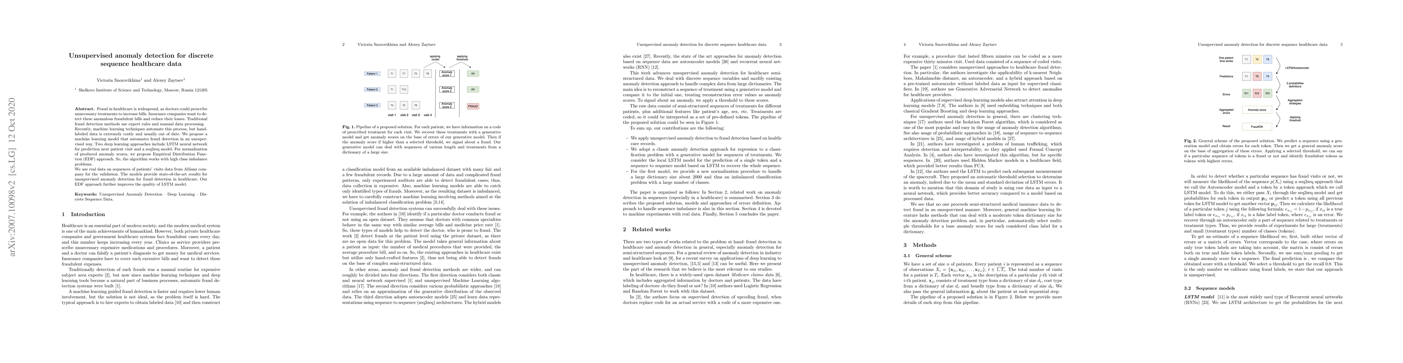 Fraud in healthcare is widespread, as doctors could prescribe unnecessary treatments to increase bills. Insurance companies want to detect these anomalous fraudulent bills and reduce their losses. Traditional fraud detection methods use expert rules and manual data processing. Recently, machine learning techniques automate this process, but hand-labeled data is extremely costly and usually out of date. We propose a machine learning model that automates fraud detection in an unsupervised way. Two deep learning approaches include LSTM neural network for prediction next patient visit and a seq2seq model. For normalization of produced anomaly scores, we propose Empirical Distribution Function (EDF) approach. So, the algorithm works with high class imbalance problems. We use real data on sequences of patients' visits data from Allianz company for the validation. The models provide state-of-the-art results for unsupervised anomaly detection for fraud detection in healthcare. Our EDF approach further improves the quality of LSTM model.