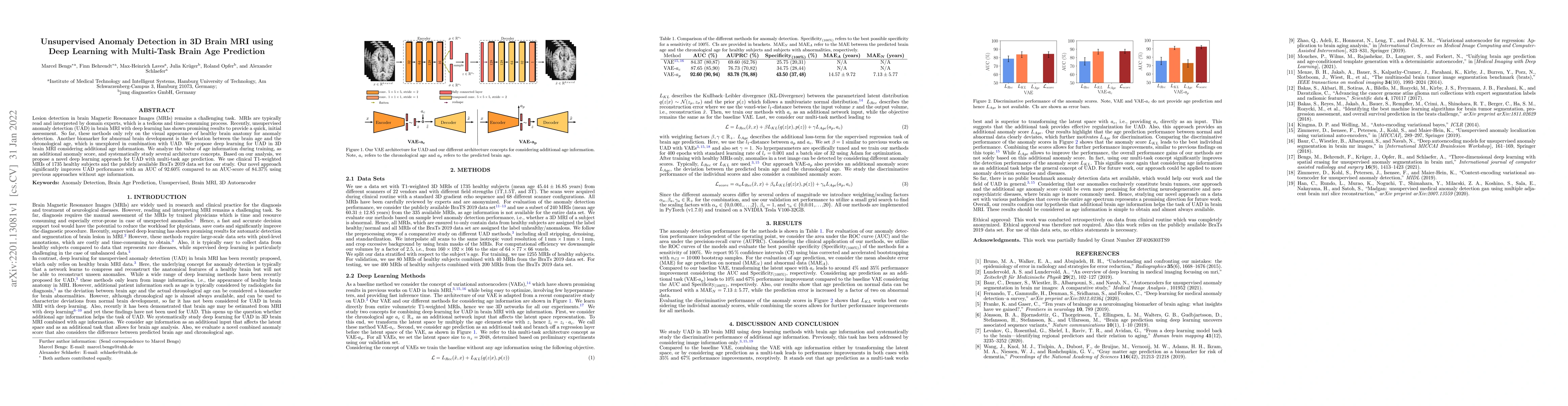 This paper proposes a deep learning method for unsupervised anomaly detection in 3D brain MRIs by integrating multi-task brain age prediction, significantly improving detection performance with an AUC of 92.60% compared to 84.37% using previous methods. The study explores the value of age information in training and evaluates various architecture concepts.
