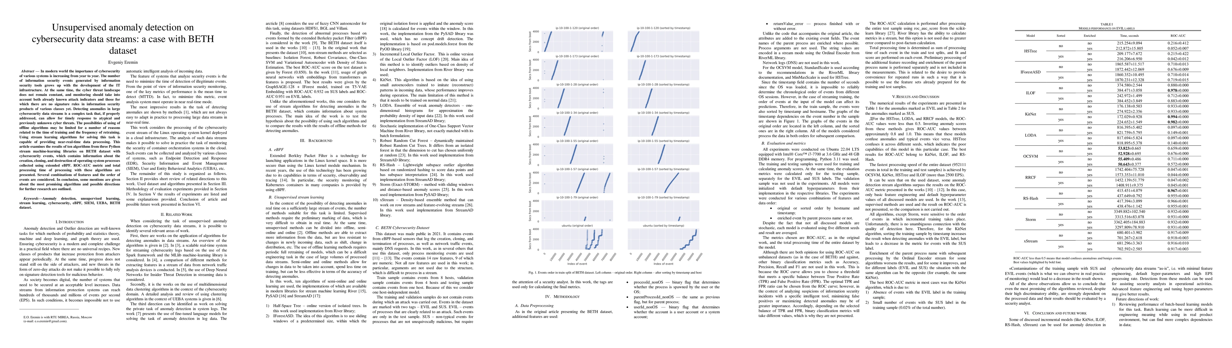 This paper explores unsupervised anomaly detection in cybersecurity data streams using the BETH dataset, evaluating ten stream learning algorithms from Python libraries. The study highlights the effectiveness of these algorithms in detecting both known and unknown cyber threats in real-time, with a focus on ROC-AUC metrics and processing time.