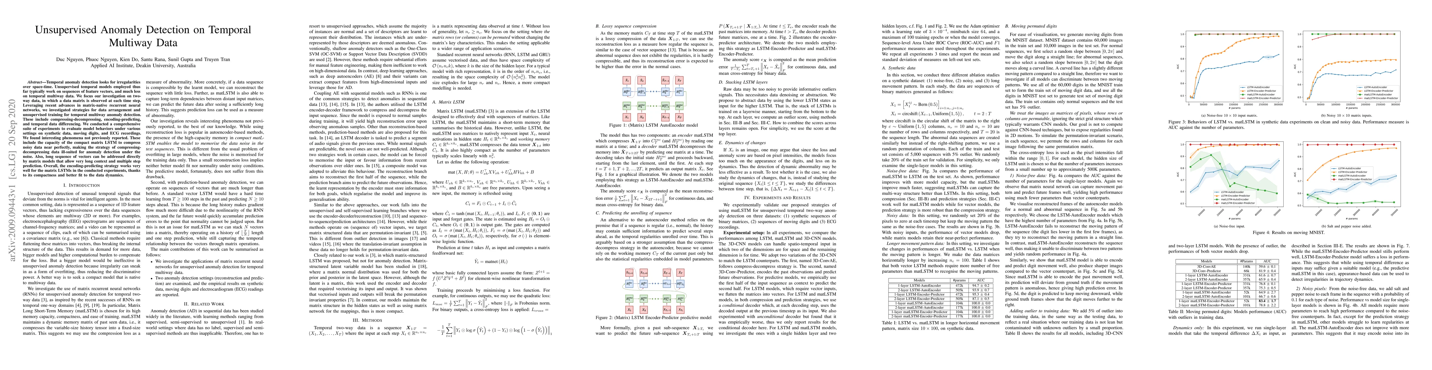 Temporal anomaly detection looks for irregularities over space-time. Unsupervised temporal models employed thus far typically work on sequences of feature vectors, and much less on temporal multiway data. We focus our investigation on two-way data, in which a data matrix is observed at each time step. Leveraging recent advances in matrix-native recurrent neural networks, we investigated strategies for data arrangement and unsupervised training for temporal multiway anomaly detection. These include compressing-decompressing, encoding-predicting, and temporal data differencing. We conducted a comprehensive suite of experiments to evaluate model behaviors under various settings on synthetic data, moving digits, and ECG recordings. We found interesting phenomena not previously reported. These include the capacity of the compact matrix LSTM to compress noisy data near perfectly, making the strategy of compressing-decompressing data ill-suited for anomaly detection under the noise. Also, long sequence of vectors can be addressed directly by matrix models that allow very long context and multiple step prediction. Overall, the encoding-predicting strategy works very well for the matrix LSTMs in the conducted experiments, thanks to its compactness and better fit to the data dynamics.