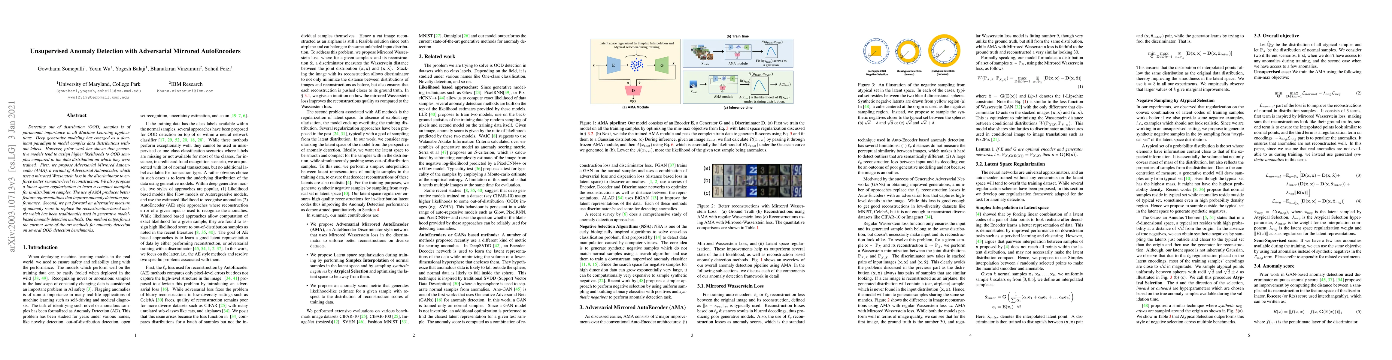 This paper proposes Adversarial Mirrored Autoencoder (AMA) for unsupervised anomaly detection, utilizing a mirrored Wasserstein loss and latent space regularization to enhance feature representations. It introduces an alternative anomaly score measure, achieving superior performance compared to existing state-of-the-art methods on various benchmarks.
