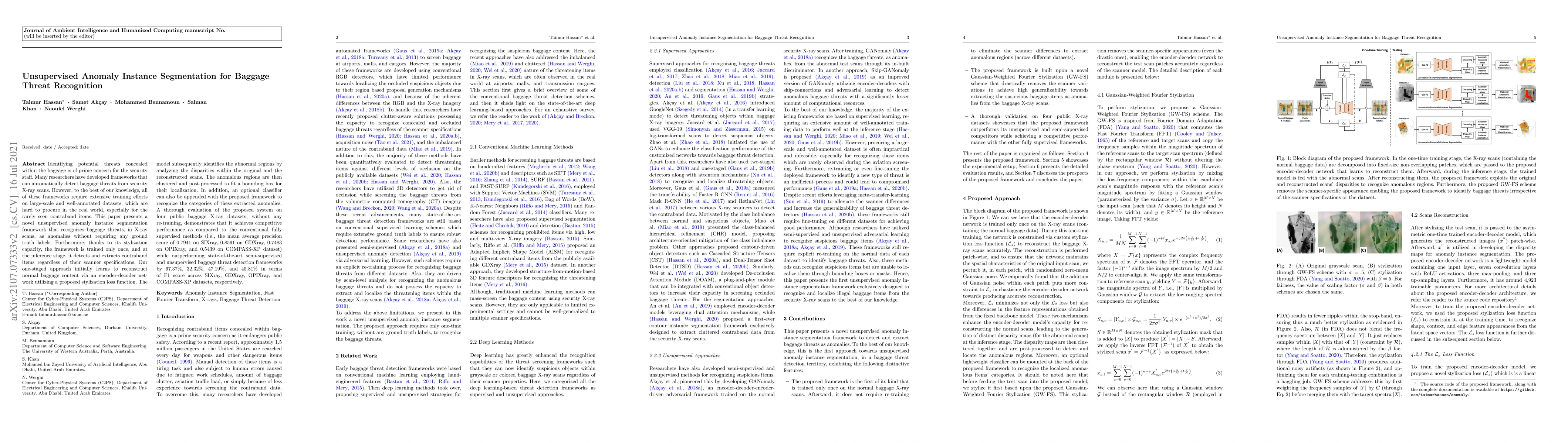 Identifying potential threats concealed within the baggage is of prime concern for the security staff. Many researchers have developed frameworks that can detect baggage threats from X-ray scans. However, to the best of our knowledge, all of these frameworks require extensive training on large-scale and well-annotated datasets, which are hard to procure in the real world. This paper presents a novel unsupervised anomaly instance segmentation framework that recognizes baggage threats, in X-ray scans, as anomalies without requiring any ground truth labels. Furthermore, thanks to its stylization capacity, the framework is trained only once, and at the inference stage, it detects and extracts contraband items regardless of their scanner specifications. Our one-staged approach initially learns to reconstruct normal baggage content via an encoder-decoder network utilizing a proposed stylization loss function. The model subsequently identifies the abnormal regions by analyzing the disparities within the original and the reconstructed scans. The anomalous regions are then clustered and post-processed to fit a bounding box for their localization. In addition, an optional classifier can also be appended with the proposed framework to recognize the categories of these extracted anomalies. A thorough evaluation of the proposed system on four public baggage X-ray datasets, without any re-training, demonstrates that it achieves competitive performance as compared to the conventional fully supervised methods (i.e., the mean average precision score of 0.7941 on SIXray, 0.8591 on GDXray, 0.7483 on OPIXray, and 0.5439 on COMPASS-XP dataset) while outperforming state-of-the-art semi-supervised and unsupervised baggage threat detection frameworks by 67.37%, 32.32%, 47.19%, and 45.81% in terms of F1 score across SIXray, GDXray, OPIXray, and COMPASS-XP datasets, respectively.