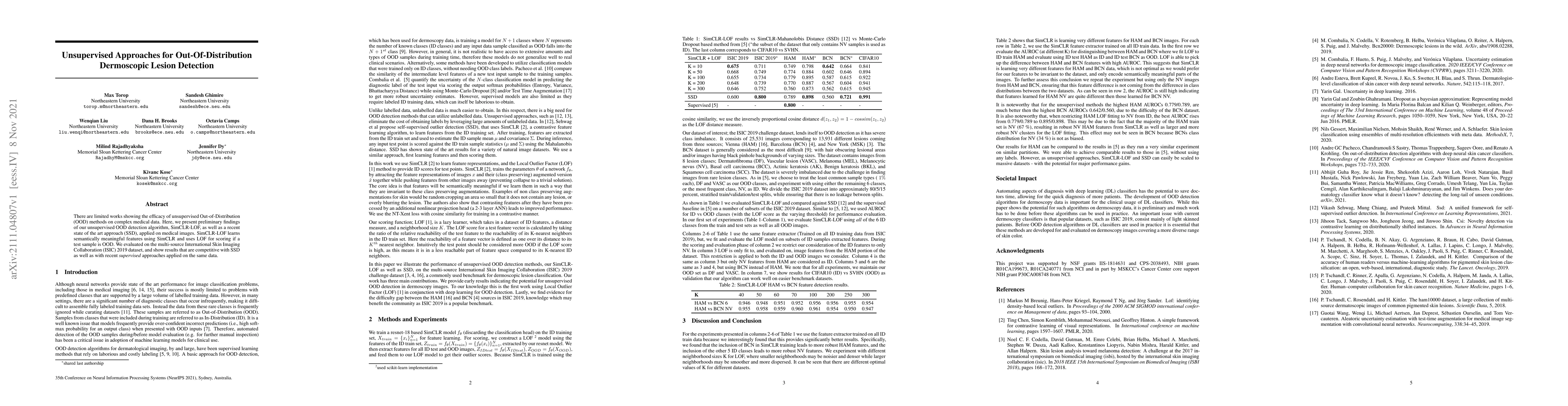 There are limited works showing the efficacy of unsupervised Out-of-Distribution (OOD) methods on complex medical data. Here, we present preliminary findings of our unsupervised OOD detection algorithm, SimCLR-LOF, as well as a recent state of the art approach (SSD), applied on medical images. SimCLR-LOF learns semantically meaningful features using SimCLR and uses LOF for scoring if a test sample is OOD. We evaluated on the multi-source International Skin Imaging Collaboration (ISIC) 2019 dataset, and show results that are competitive with SSD as well as with recent supervised approaches applied on the same data.