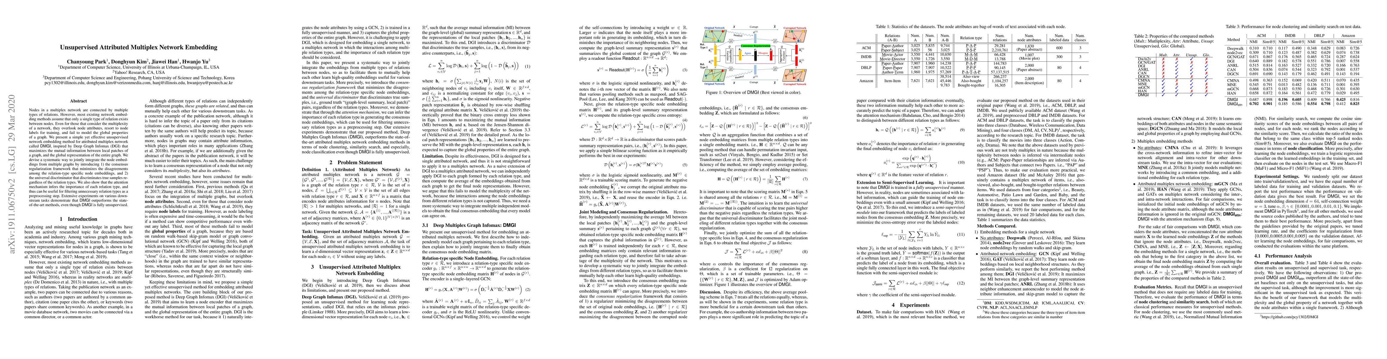 This paper proposes DMGI, an unsupervised network embedding method for attributed multiplex networks that maximizes mutual information between local graph patches and global representations. It integrates embeddings across multiple relation types using consensus regularization and a universal discriminator, and outperforms state-of-the-art methods in various tasks.