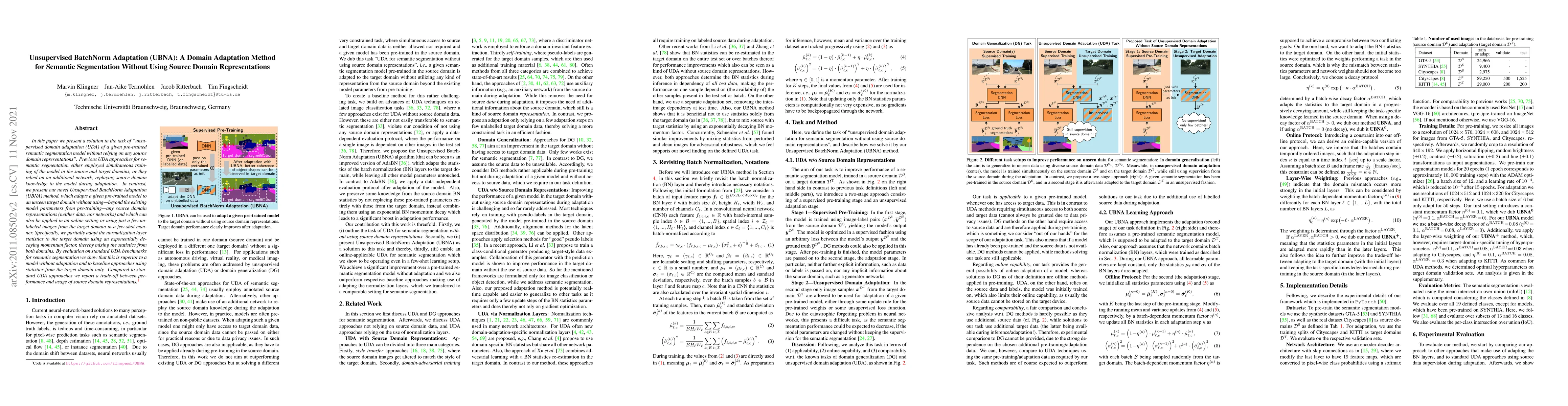 This paper introduces Unsupervised BatchNorm Adaptation (UBNA), a novel method for unsupervised domain adaptation in semantic segmentation that does not require source domain data or representations. UBNA adapts a pre-trained model to a new target domain by partially updating normalization layer statistics, achieving superior performance compared to baselines.