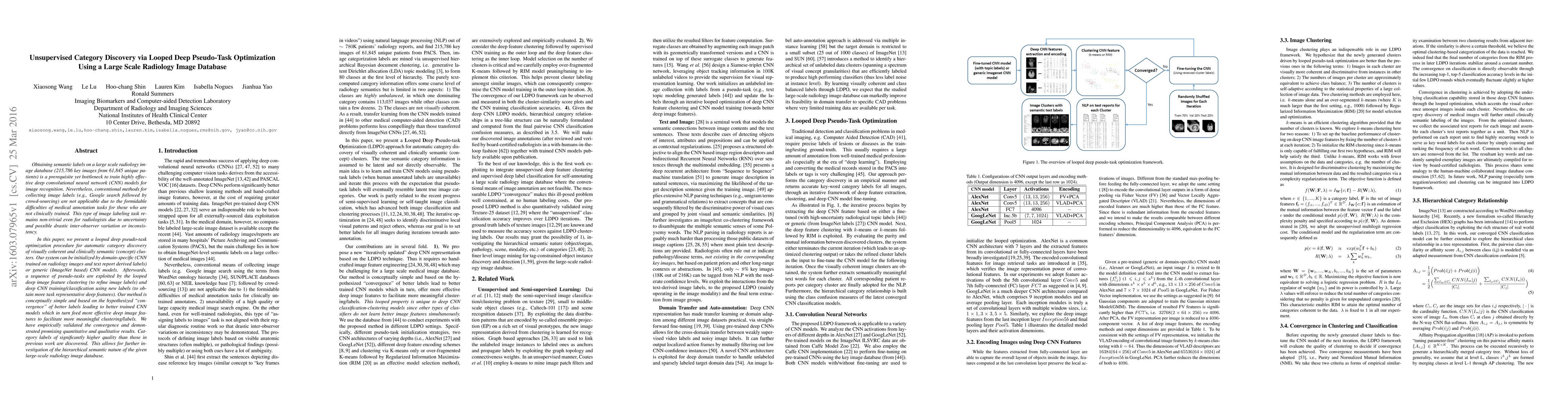 Obtaining semantic labels on a large scale radiology image database (215,786 key images from 61,845 unique patients) is a prerequisite yet bottleneck to train highly effective deep convolutional neural network (CNN) models for image recognition. Nevertheless, conventional methods for collecting image labels (e.g., Google search followed by crowd-sourcing) are not applicable due to the formidable difficulties of medical annotation tasks for those who are not clinically trained. This type of image labeling task remains non-trivial even for radiologists due to uncertainty and possible drastic inter-observer variation or inconsistency. In this paper, we present a looped deep pseudo-task optimization procedure for automatic category discovery of visually coherent and clinically semantic (concept) clusters. Our system can be initialized by domain-specific (CNN trained on radiology images and text report derived labels) or generic (ImageNet based) CNN models. Afterwards, a sequence of pseudo-tasks are exploited by the looped deep image feature clustering (to refine image labels) and deep CNN training/classification using new labels (to obtain more task representative deep features). Our method is conceptually simple and based on the hypothesized "convergence" of better labels leading to better trained CNN models which in turn feed more effective deep image features to facilitate more meaningful clustering/labels. We have empirically validated the convergence and demonstrated promising quantitative and qualitative results. Category labels of significantly higher quality than those in previous work are discovered. This allows for further investigation of the hierarchical semantic nature of the given large-scale radiology image database.
