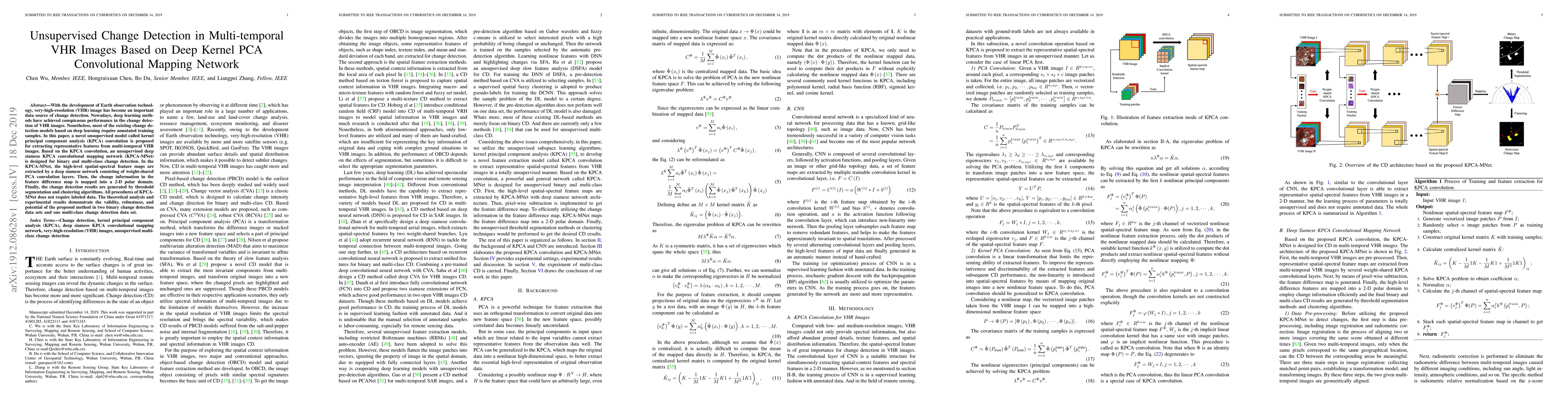 This paper proposes an unsupervised deep learning model, KPCA-MNet, for change detection in very-high-resolution (VHR) images using kernel principal component analysis (KPCA) convolution. The model extracts spatial-spectral features without requiring labeled data, demonstrating effectiveness in binary and multi-class change detection tasks.