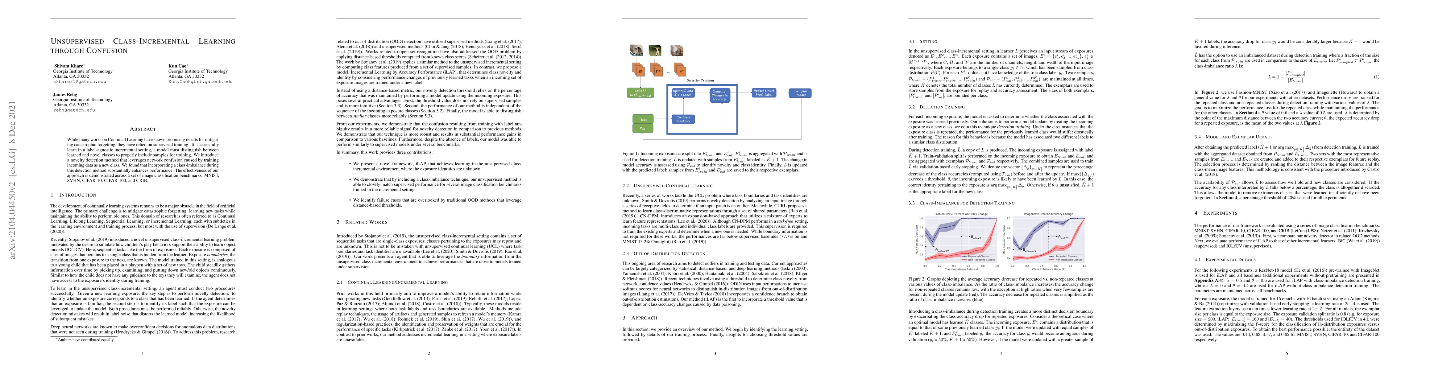 This paper proposes an unsupervised class-incremental learning method that uses network confusion to detect novel classes without labeled data, achieving enhanced performance through class-imbalance strategies, validated across multiple image classification benchmarks.