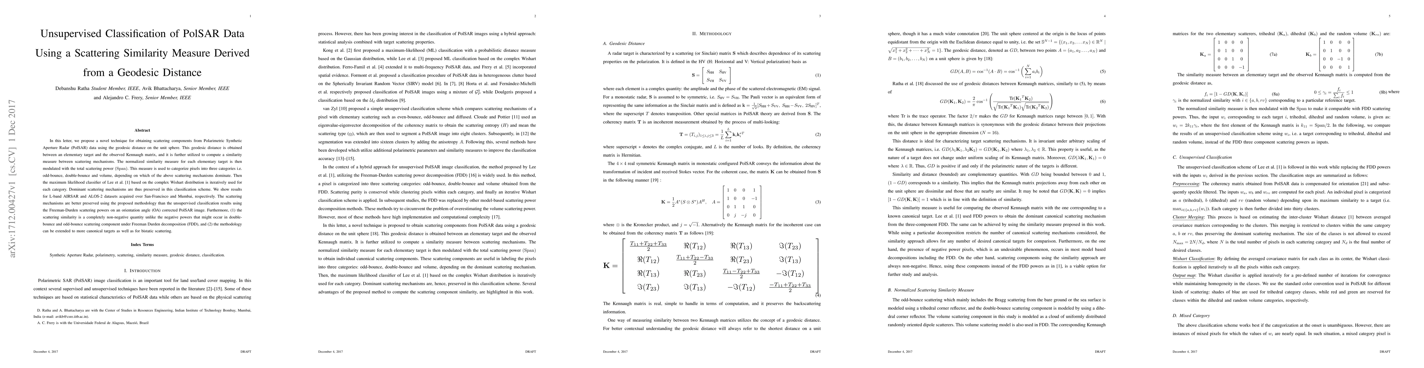 This paper proposes a novel unsupervised classification technique for PolSAR data using a geodesic distance-derived scattering similarity measure. The method categorizes pixels based on dominant scattering mechanisms, preserving these mechanisms better than traditional Freeman-Durden decomposition, and can be extended to bistatic scattering.