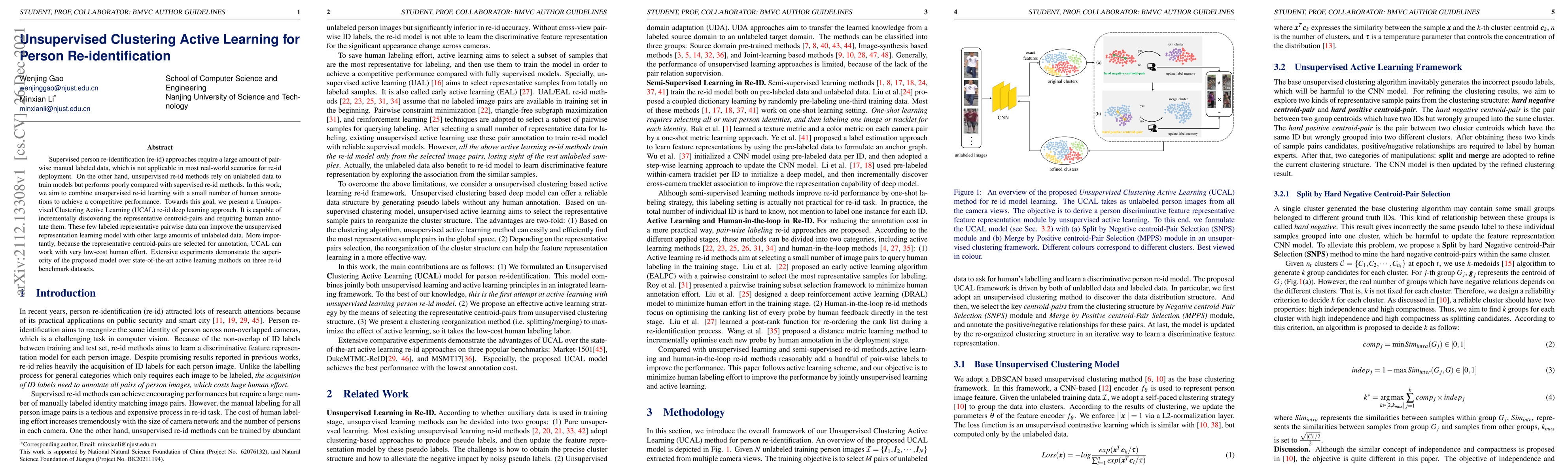 This paper proposes an Unsupervised Clustering Active Learning (UCAL) approach for person re-identification that combines unsupervised learning with a minimal amount of human-annotated data to improve model performance. The method identifies and labels representative centroid-pairs, requiring low-cost human effort, and demonstrates superior results compared to state-of-the-art active learning methods on benchmark datasets.