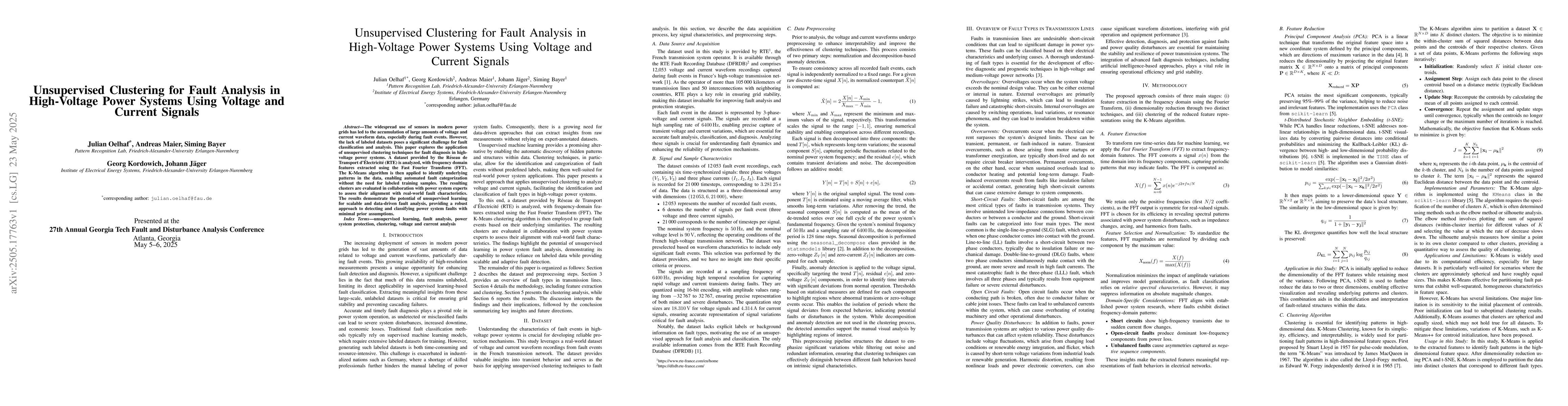 This paper applies unsupervised clustering to analyze voltage and current signals in high-voltage power systems, enabling automated fault categorization without labeled training samples. The method demonstrates potential for scalable and data-driven fault analysis with minimal prior assumptions.