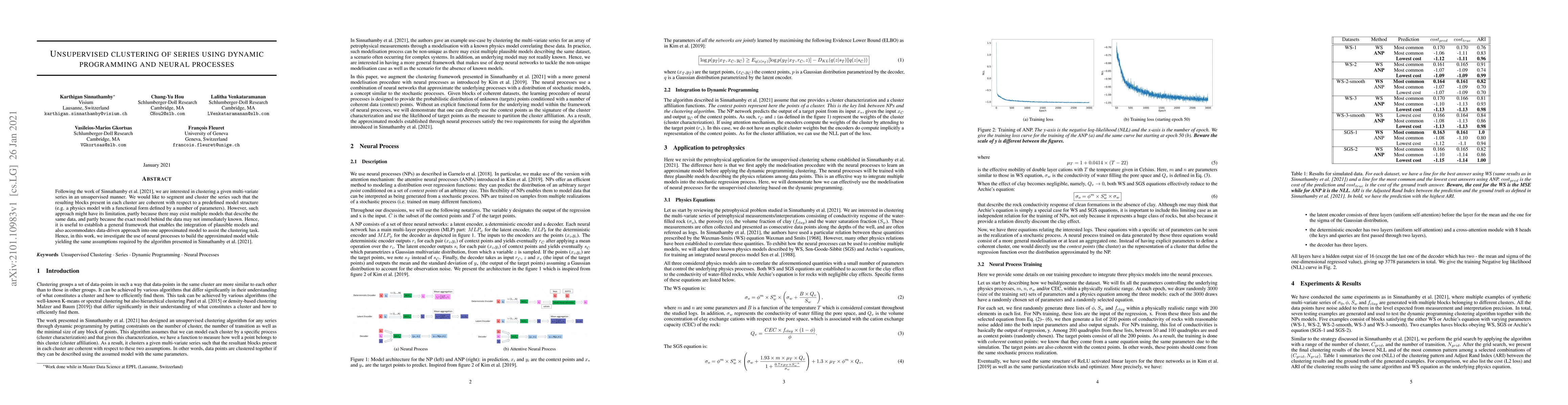 This paper proposes an unsupervised clustering method for multi-variate series using dynamic programming and neural processes. It aims to integrate plausible models and data-driven approaches to create an approximated model for clustering, addressing the limitations of predefined models.