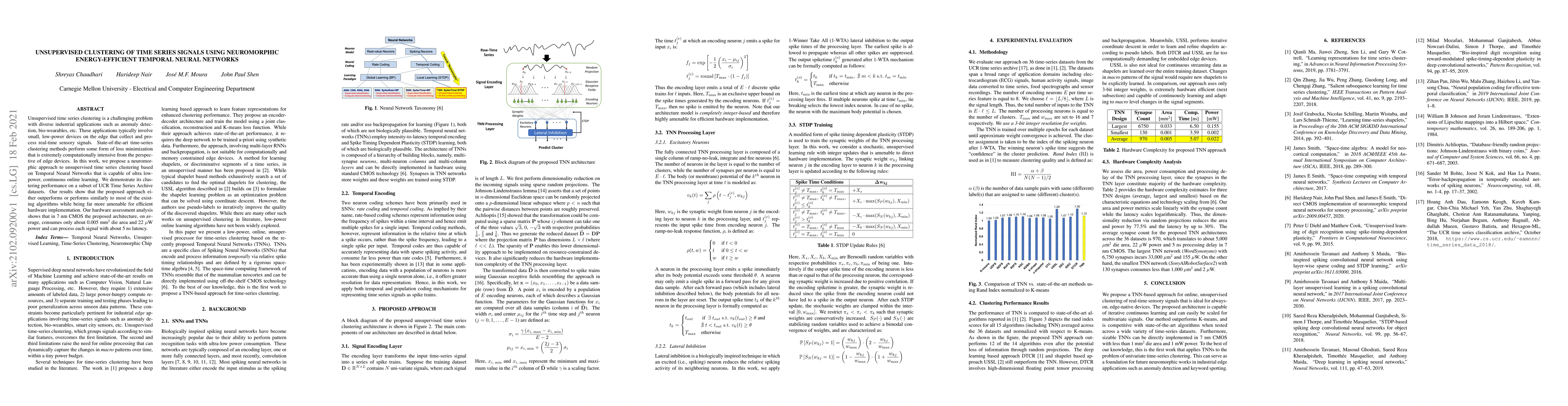 This paper proposes a neuromorphic energy-efficient temporal neural network for unsupervised time series clustering, demonstrating comparable performance to existing methods while significantly reducing computational load, power consumption, and latency for edge devices. The architecture consumes only 22 µW and 0.005 mm² die area in 7 nm CMOS.