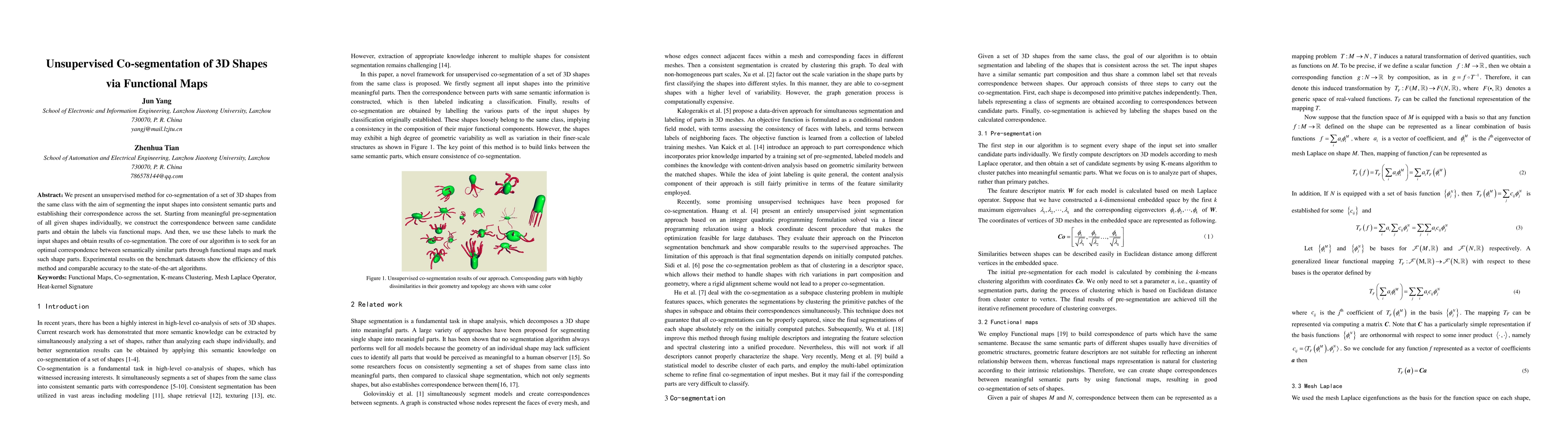 This paper proposes an unsupervised method for co-segmenting 3D shapes into consistent parts, establishing correspondence across the set using functional maps and achieving comparable accuracy to state-of-the-art algorithms.