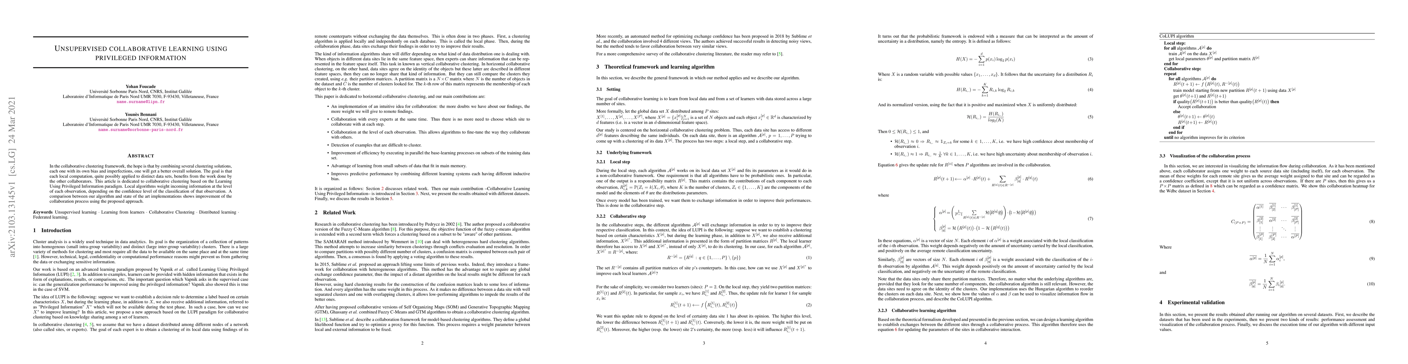 The research focuses on unsupervised collaborative learning using the Learning Using Privileged Information (LUPI) paradigm for clustering. It introduces Co-LUPI and RCo-LUPI algorithms that leverage local classification uncertainties to fine-tune collaboration across different data sites.