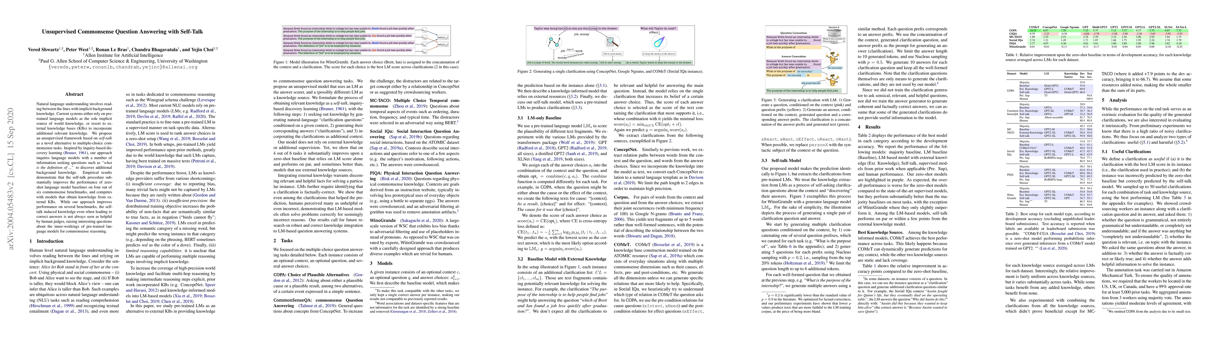 Natural language understanding involves reading between the lines with implicit background knowledge. Current systems either rely on pre-trained language models as the sole implicit source of world knowledge, or resort to external knowledge bases (KBs) to incorporate additional relevant knowledge. We propose an unsupervised framework based on self-talk as a novel alternative to multiple-choice commonsense tasks. Inspired by inquiry-based discovery learning (Bruner, 1961), our approach inquires language models with a number of information seeking questions such as "$\textit{what is the definition of ...}$" to discover additional background knowledge. Empirical results demonstrate that the self-talk procedure substantially improves the performance of zero-shot language model baselines on four out of six commonsense benchmarks, and competes with models that obtain knowledge from external KBs. While our approach improves performance on several benchmarks, the self-talk induced knowledge even when leading to correct answers is not always seen as useful by human judges, raising interesting questions about the inner-workings of pre-trained language models for commonsense reasoning.