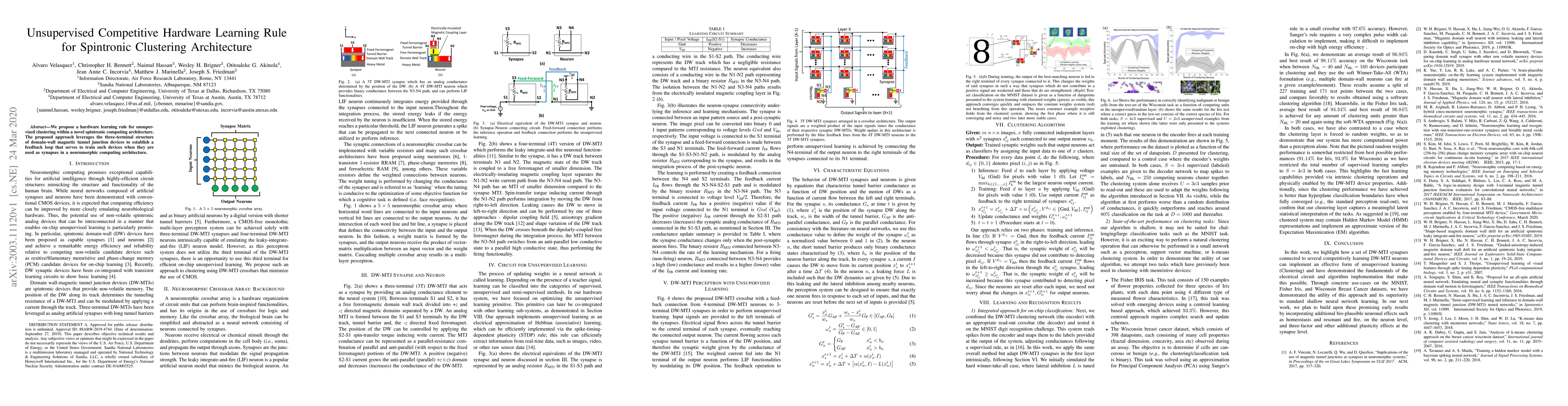 Summary: This paper introduces a novel unsupervised learning rule for spintronic devices, utilizing domain-wall magnetic tunnel junctions in a three-terminal structure to create a feedback loop for training neuromorphic computing synapses. The approach aims to enhance clustering capabilities in spintronic architectures.