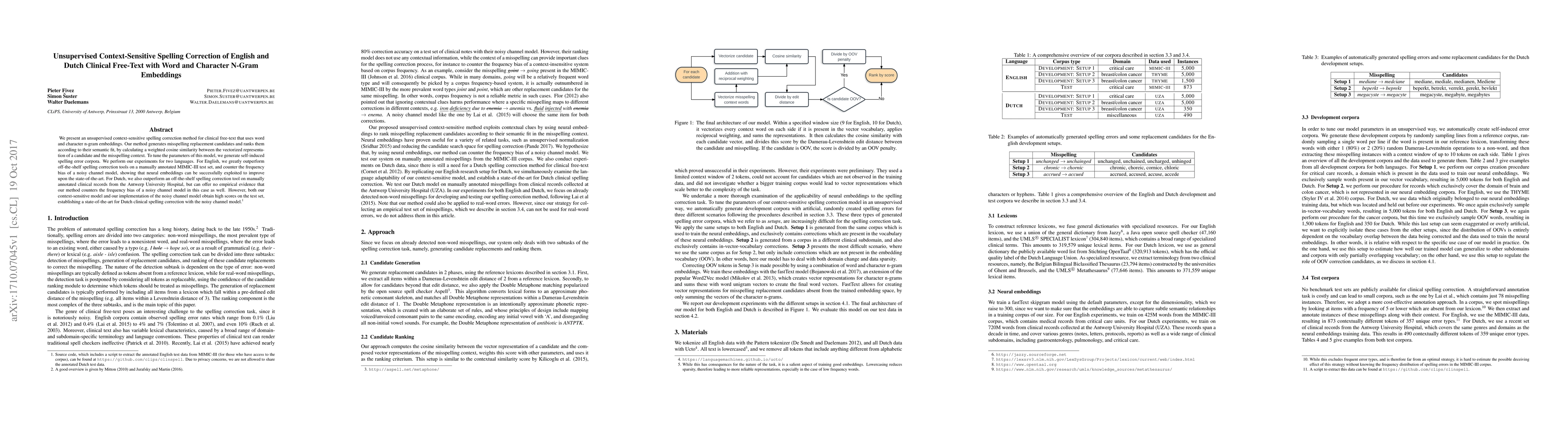 This paper introduces an unsupervised method for context-sensitive spelling correction in clinical free-text using word and character n-gram embeddings, outperforming existing tools in English and establishing a new standard for Dutch. The method counters frequency bias in English but lacks empirical evidence for Dutch.
