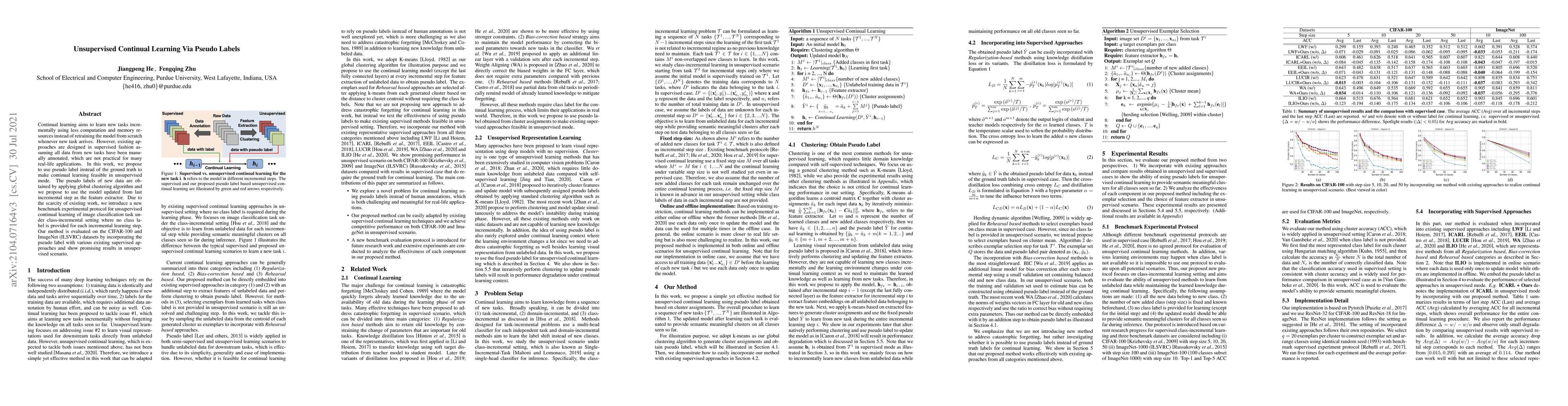 Continual learning aims to learn new tasks incrementally using less computation and memory resources instead of retraining the model from scratch whenever new task arrives. However, existing approaches are designed in supervised fashion assuming all data from new tasks have been manually annotated, which are not practical for many real-life applications. In this work, we propose to use pseudo label instead of the ground truth to make continual learning feasible in unsupervised mode. The pseudo labels of new data are obtained by applying global clustering algorithm and we propose to use the model updated from last incremental step as the feature extractor. Due to the scarcity of existing work, we introduce a new benchmark experimental protocol for unsupervised continual learning of image classification task under class-incremental setting where no class label is provided for each incremental learning step. Our method is evaluated on the CIFAR-100 and ImageNet (ILSVRC) datasets by incorporating the pseudo label with various existing supervised approaches and show promising results in unsupervised scenario.