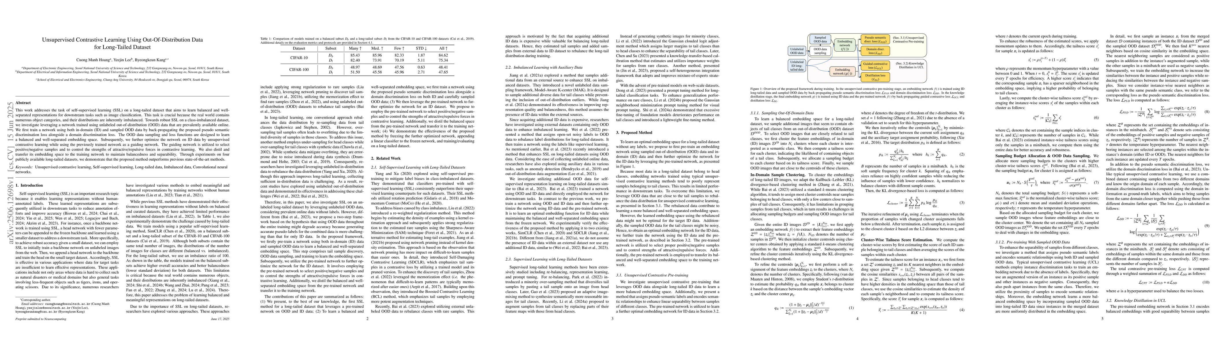 This work addresses the task of self-supervised learning (SSL) on a long-tailed dataset that aims to learn balanced and well-separated representations for downstream tasks such as image classification. This task is crucial because the real world contains numerous object categories, and their distributions are inherently imbalanced. Towards robust SSL on a class-imbalanced dataset, we investigate leveraging a network trained using unlabeled out-of-distribution (OOD) data that are prevalently available online. We first train a network using both in-domain (ID) and sampled OOD data by back-propagating the proposed pseudo semantic discrimination loss alongside a domain discrimination loss. The OOD data sampling and loss functions are designed to learn a balanced and well-separated embedding space. Subsequently, we further optimize the network on ID data by unsupervised contrastive learning while using the previously trained network as a guiding network. The guiding network is utilized to select positive/negative samples and to control the strengths of attractive/repulsive forces in contrastive learning. We also distil and transfer its embedding space to the training network to maintain balancedness and separability. Through experiments on four publicly available long-tailed datasets, we demonstrate that the proposed method outperforms previous state-of-the-art methods.