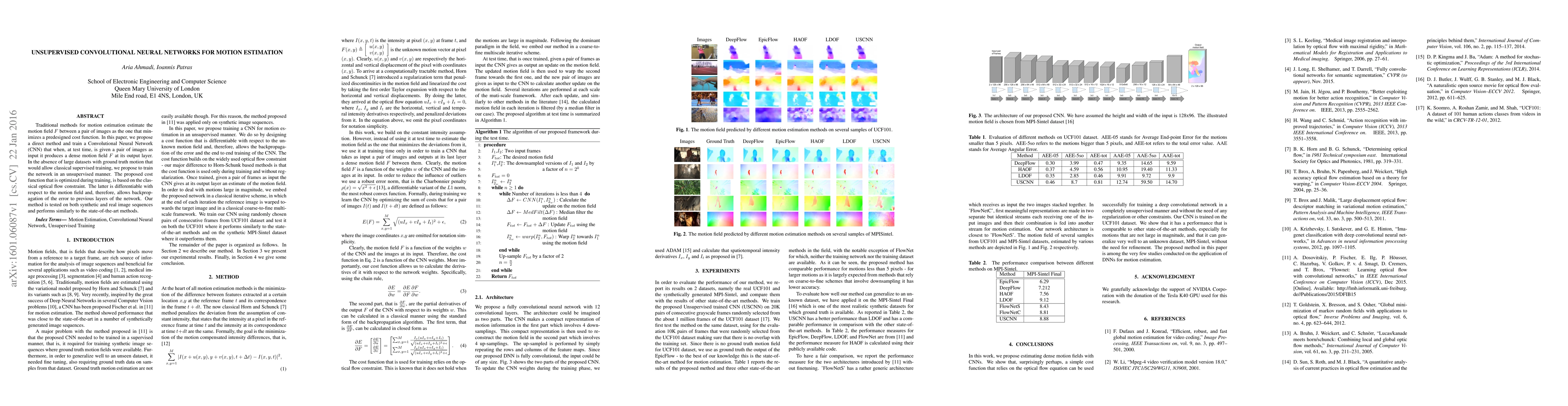Traditional methods for motion estimation estimate the motion field F between a pair of images as the one that minimizes a predesigned cost function. In this paper, we propose a direct method and train a Convolutional Neural Network (CNN) that when, at test time, is given a pair of images as input it produces a dense motion field F at its output layer. In the absence of large datasets with ground truth motion that would allow classical supervised training, we propose to train the network in an unsupervised manner. The proposed cost function that is optimized during training, is based on the classical optical flow constraint. The latter is differentiable with respect to the motion field and, therefore, allows backpropagation of the error to previous layers of the network. Our method is tested on both synthetic and real image sequences and performs similarly to the state-of-the-art methods.