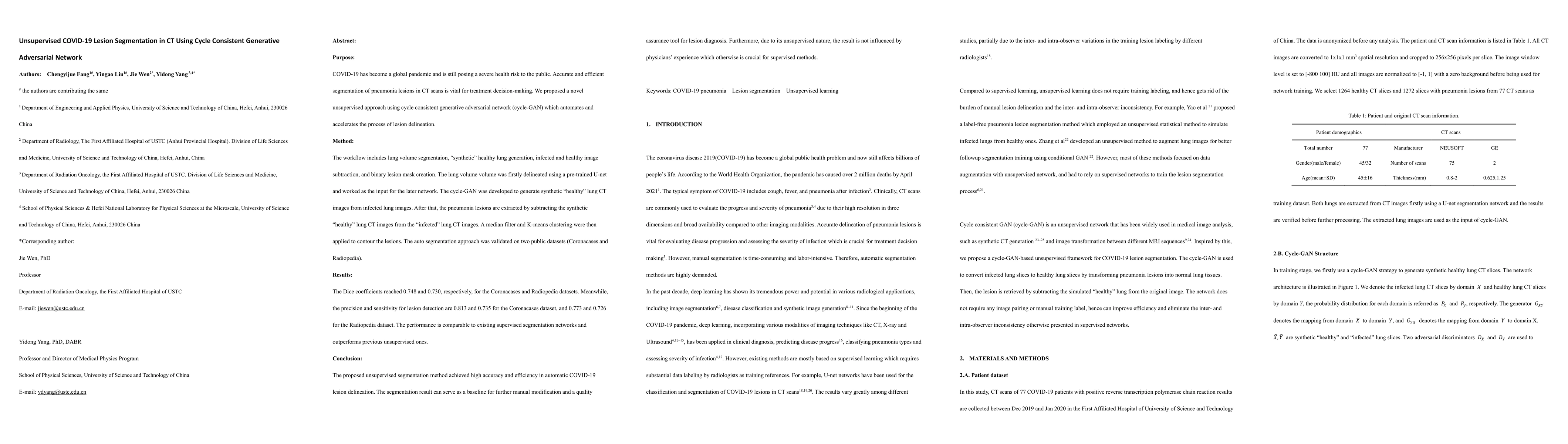 This paper proposes an unsupervised segmentation method using a cycle-consistent generative adversarial network (cycle-GAN) to automatically delineate COVID-19 lesions in CT scans, achieving high accuracy comparable to supervised methods and outperforming previous unsupervised techniques. The method includes synthetic healthy lung generation and lesion extraction via subtraction, validated on two datasets with promising Dice coefficients and precision/sensitivity scores.