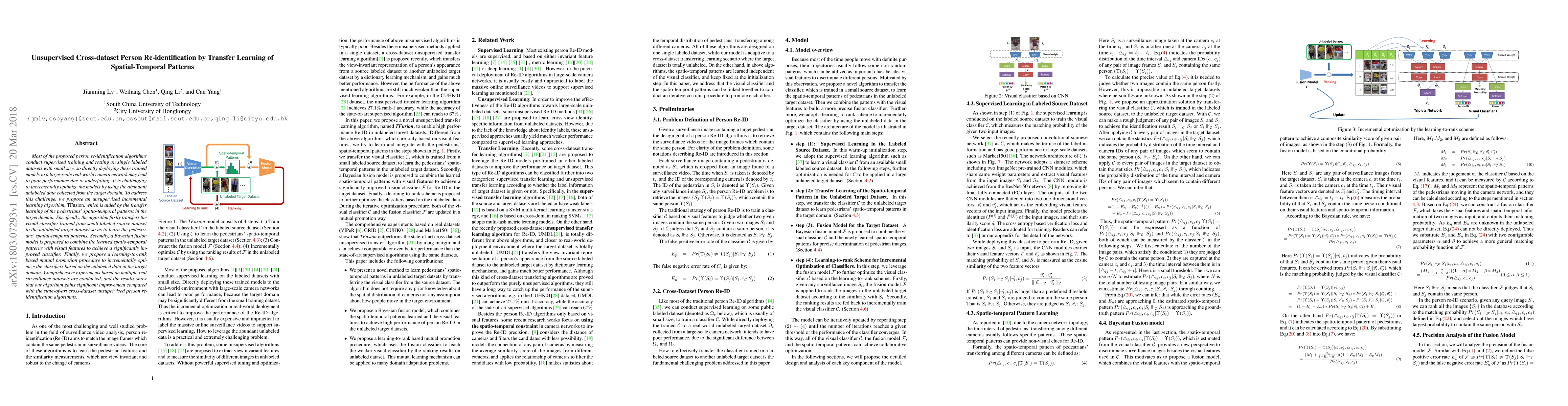 This paper proposes an unsupervised cross-dataset person re-identification method, TFusion, which leverages transfer learning of spatial-temporal patterns to incrementally optimize models using abundant unlabeled target domain data. The method significantly improves performance over state-of-the-art algorithms in real surveillance datasets.
