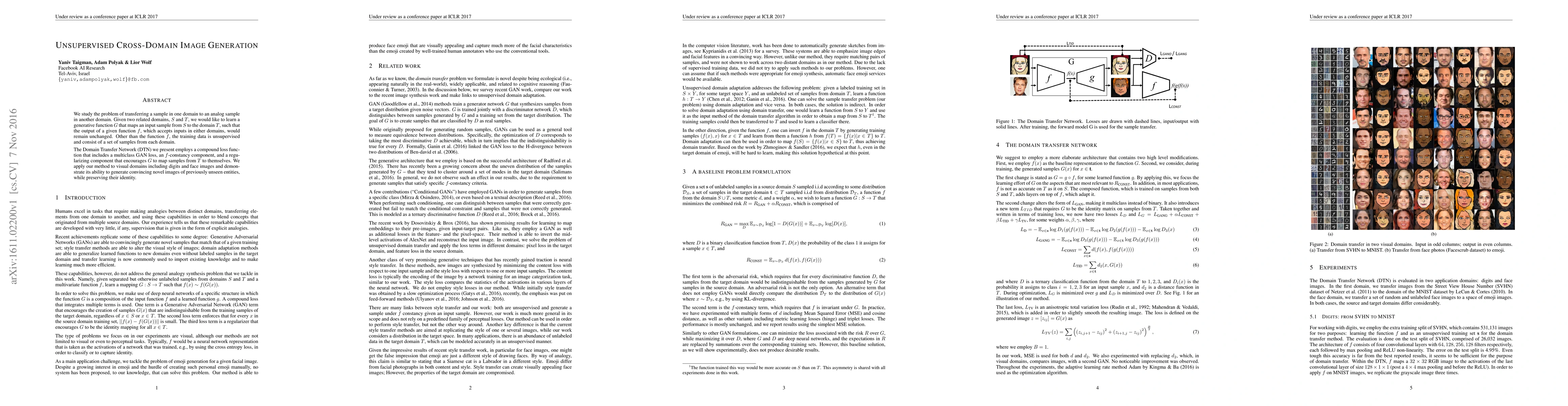We study the problem of transferring a sample in one domain to an analog sample in another domain. Given two related domains, S and T, we would like to learn a generative function G that maps an input sample from S to the domain T, such that the output of a given function f, which accepts inputs in either domains, would remain unchanged. Other than the function f, the training data is unsupervised and consist of a set of samples from each domain. The Domain Transfer Network (DTN) we present employs a compound loss function that includes a multiclass GAN loss, an f-constancy component, and a regularizing component that encourages G to map samples from T to themselves. We apply our method to visual domains including digits and face images and demonstrate its ability to generate convincing novel images of previously unseen entities, while preserving their identity.
