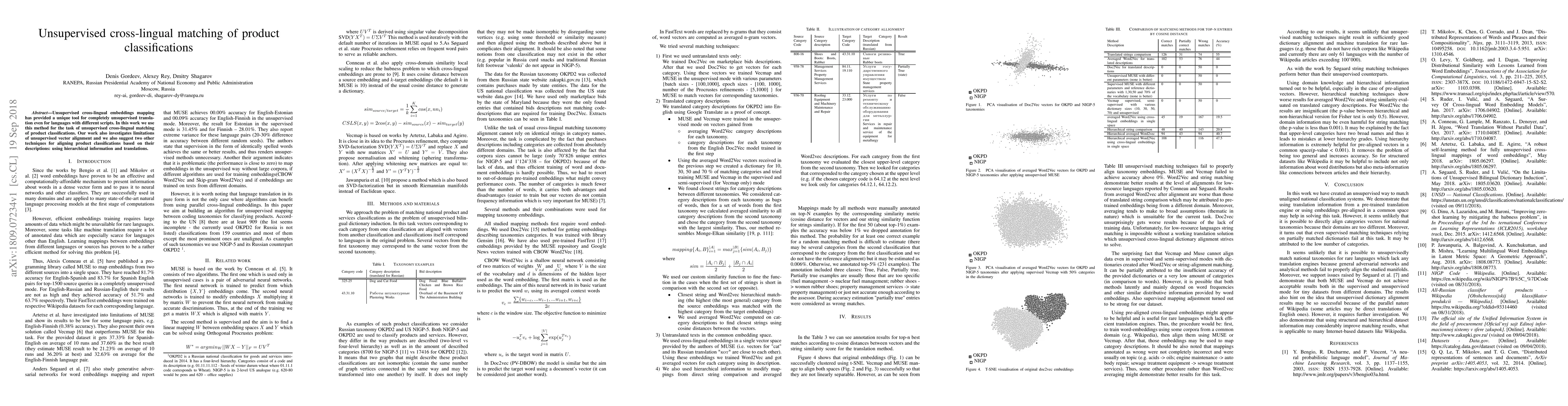 This paper explores unsupervised cross-lingual embeddings for matching product classifications across languages, highlighting limitations of vector alignment and proposing alternative methods leveraging hierarchical information and translations.