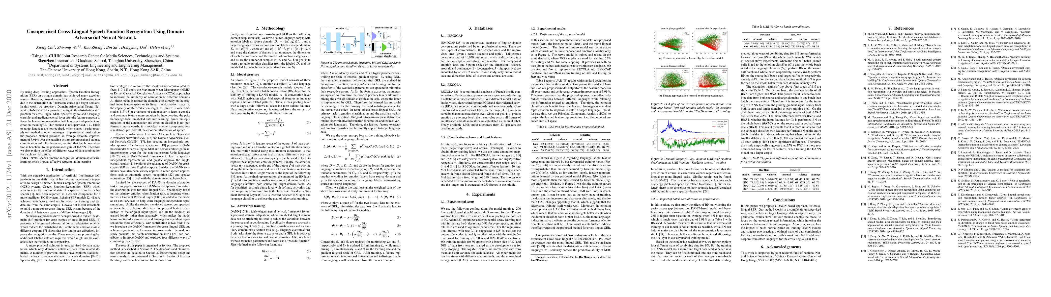 By using deep learning approaches, Speech Emotion Recog-nition (SER) on a single domain has achieved many excellentresults. However, cross-domain SER is still a challenging taskdue to the distribution shift between source and target domains.In this work, we propose a Domain Adversarial Neural Net-work (DANN) based approach to mitigate this distribution shiftproblem for cross-lingual SER. Specifically, we add a languageclassifier and gradient reversal layer after the feature extractor toforce the learned representation both language-independent andemotion-meaningful. Our method is unsupervised, i. e., labelson target language are not required, which makes it easier to ap-ply our method to other languages. Experimental results showthe proposed method provides an average absolute improve-ment of 3.91% over the baseline system for arousal and valenceclassification task. Furthermore, we find that batch normaliza-tion is beneficial to the performance gain of DANN. Thereforewe also explore the effect of different ways of data combinationfor batch normalization.