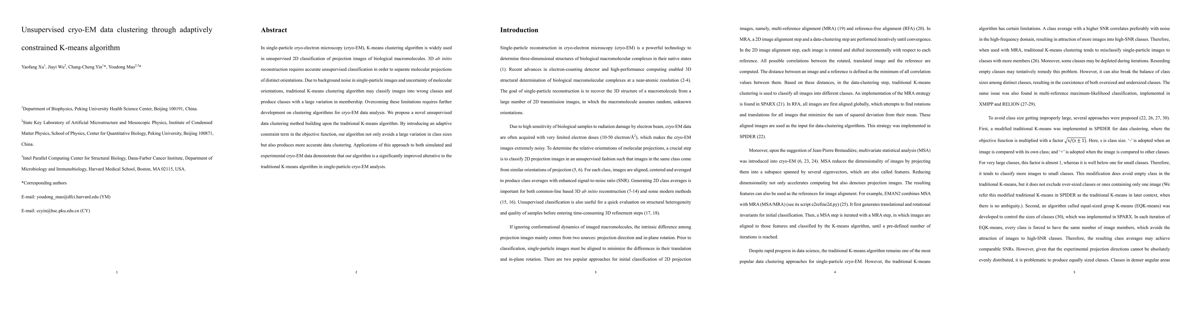 This paper proposes an adaptively constrained K-means algorithm for unsupervised clustering in cryo-EM data analysis, addressing the limitations of traditional K-means by introducing a constraint term to reduce class size variation and improve classification accuracy. The new method is shown to outperform traditional K-means on both simulated and real cryo-EM data.