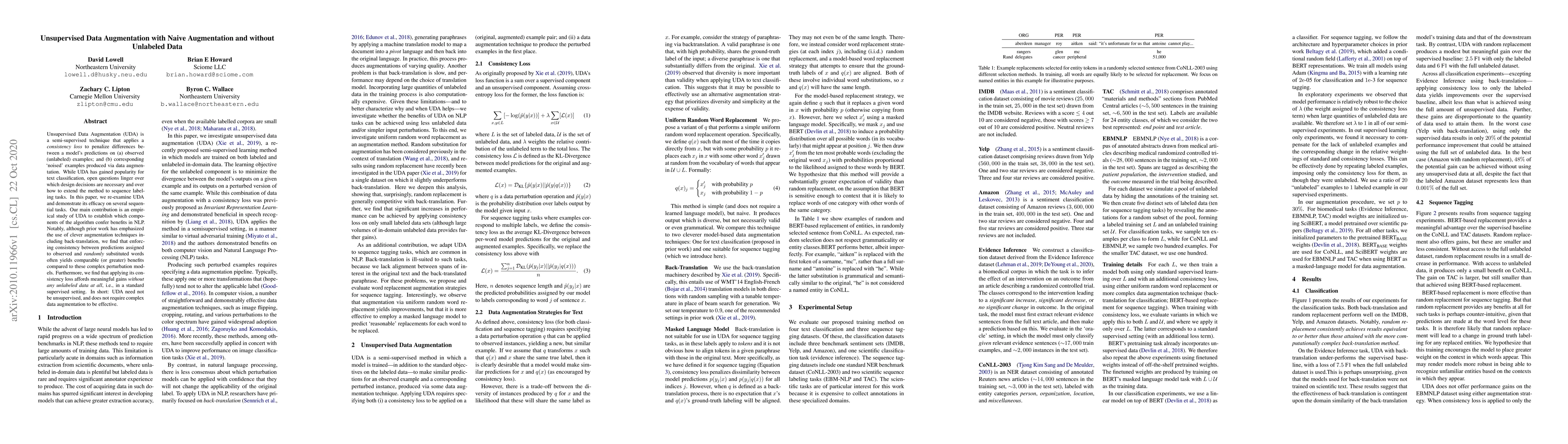 Unsupervised Data Augmentation (UDA) is a semi-supervised technique that applies a consistency loss to penalize differences between a model's predictions on (a) observed (unlabeled) examples; and (b) corresponding 'noised' examples produced via data augmentation. While UDA has gained popularity for text classification, open questions linger over which design decisions are necessary and over how to extend the method to sequence labeling tasks. This method has recently gained traction for text classification. In this paper, we re-examine UDA and demonstrate its efficacy on several sequential tasks. Our main contribution is an empirical study of UDA to establish which components of the algorithm confer benefits in NLP. Notably, although prior work has emphasized the use of clever augmentation techniques including back-translation, we find that enforcing consistency between predictions assigned to observed and randomly substituted words often yields comparable (or greater) benefits compared to these complex perturbation models. Furthermore, we find that applying its consistency loss affords meaningful gains without any unlabeled data at all, i.e., in a standard supervised setting. In short: UDA need not be unsupervised, and does not require complex data augmentation to be effective.