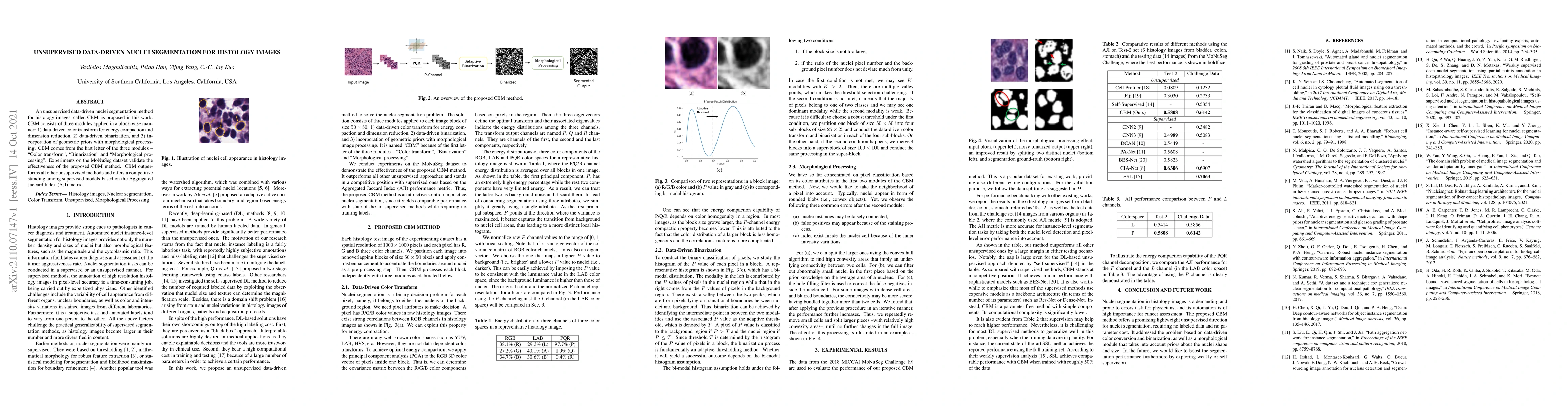 An unsupervised data-driven nuclei segmentation method for histology images, called CBM, is proposed in this work. CBM consists of three modules applied in a block-wise manner: 1) data-driven color transform for energy compaction and dimension reduction, 2) data-driven binarization, and 3) incorporation of geometric priors with morphological processing. CBM comes from the first letter of the three modules - "Color transform", "Binarization" and "Morphological processing". Experiments on the MoNuSeg dataset validate the effectiveness of the proposed CBM method. CBM outperforms all other unsupervised methods and offers a competitive standing among supervised models based on the Aggregated Jaccard Index (AJI) metric.