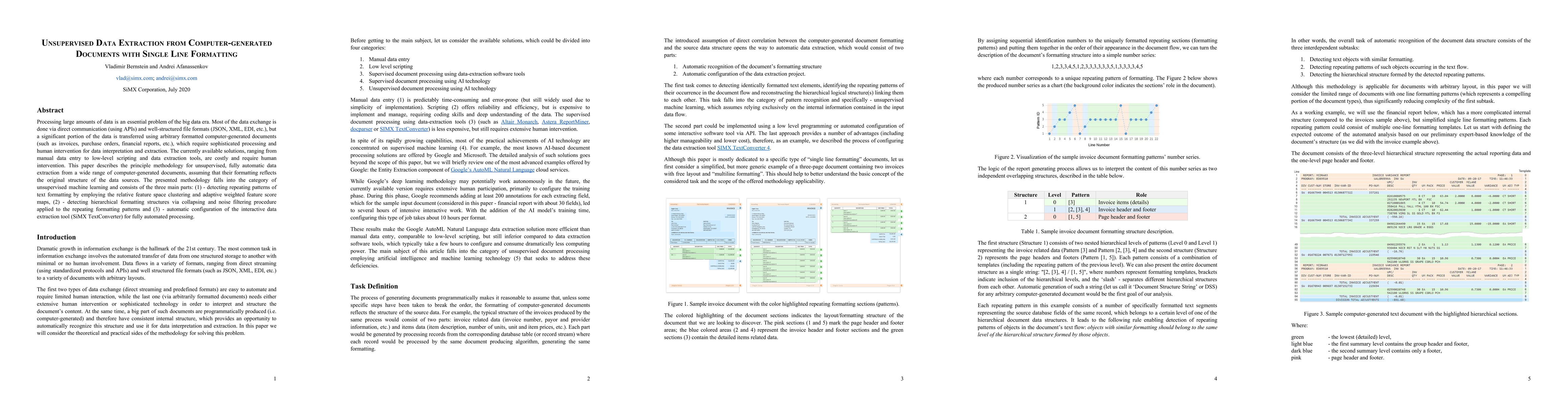 Processing large amounts of data is an essential problem of the big data era. Most of the data exchange is done via direct communication (using APIs) and well-structured file formats (JSON, XML, EDI, etc.), but a significant portion of the data is transferred using arbitrary formatted computer-generated documents (such as invoices, purchase orders, financial reports, etc.), which require sophisticated processing and human intervention for data interpretation and extraction. The currently available solutions, ranging from manual data entry to low-level scripting and data extraction tools, are costly and require human intervention. This paper describes the principle methodology for unsupervised, fully automatic data extraction from a wide range of computer-generated documents, assuming that their formatting reflects the original structure of the data sources. The presented methodology falls into the category of unsupervised machine learning and consists of the three main parts: (1) - detecting repeating patterns of text formatting by employing the relative feature space clustering and adaptive weighted feature score maps, (2) - detecting hierarchical formatting structures via collapsing and noise filtering procedure applied to the repeating formatting patterns and (3) - automatic configuration of the interactive data extraction tool (SiMX TextConverter) for fully automated processing.