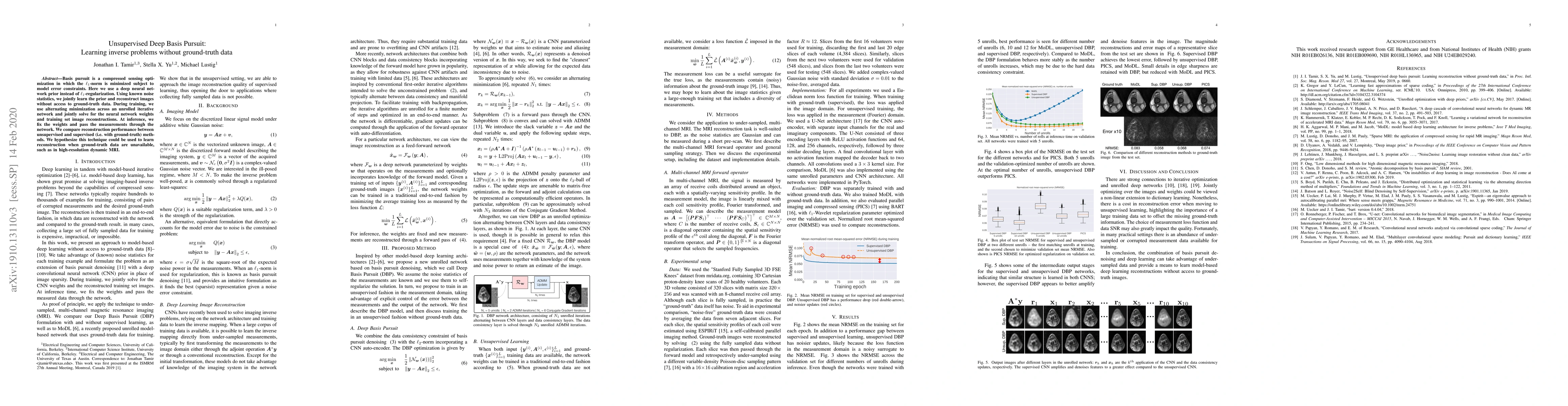 This paper proposes an unsupervised deep learning approach for solving inverse problems without ground-truth data, using a deep neural network prior in place of l1-regularization. The method trains the network and reconstructs images jointly through an unrolled iterative network, demonstrating potential for applications like high-resolution dynamic MRI where ground-truth data is scarce.