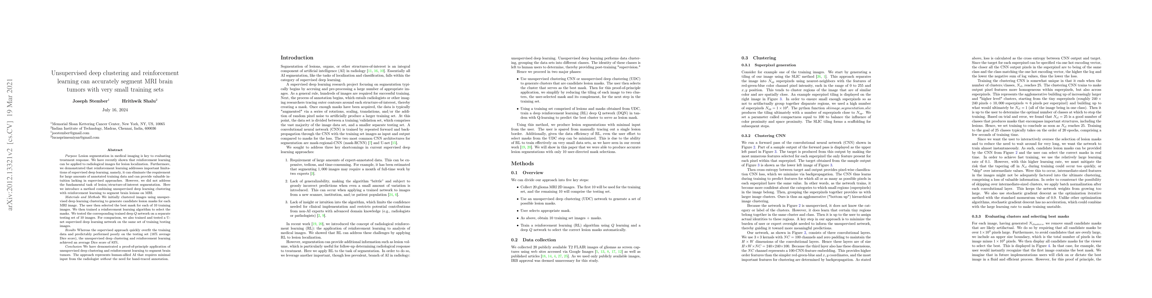 Purpose: Lesion segmentation in medical imaging is key to evaluating treatment response. We have recently shown that reinforcement learning can be applied to radiological images for lesion localization. Furthermore, we demonstrated that reinforcement learning addresses important limitations of supervised deep learning; namely, it can eliminate the requirement for large amounts of annotated training data and can provide valuable intuition lacking in supervised approaches. However, we did not address the fundamental task of lesion/structure-of-interest segmentation. Here we introduce a method combining unsupervised deep learning clustering with reinforcement learning to segment brain lesions on MRI. Materials and Methods: We initially clustered images using unsupervised deep learning clustering to generate candidate lesion masks for each MRI image. The user then selected the best mask for each of 10 training images. We then trained a reinforcement learning algorithm to select the masks. We tested the corresponding trained deep Q network on a separate testing set of 10 images. For comparison, we also trained and tested a U-net supervised deep learning network on the same set of training/testing images. Results: Whereas the supervised approach quickly overfit the training data and predictably performed poorly on the testing set (16% average Dice score), the unsupervised deep clustering and reinforcement learning achieved an average Dice score of 83%. Conclusion: We have demonstrated a proof-of-principle application of unsupervised deep clustering and reinforcement learning to segment brain tumors. The approach represents human-allied AI that requires minimal input from the radiologist without the need for hand-traced annotation.